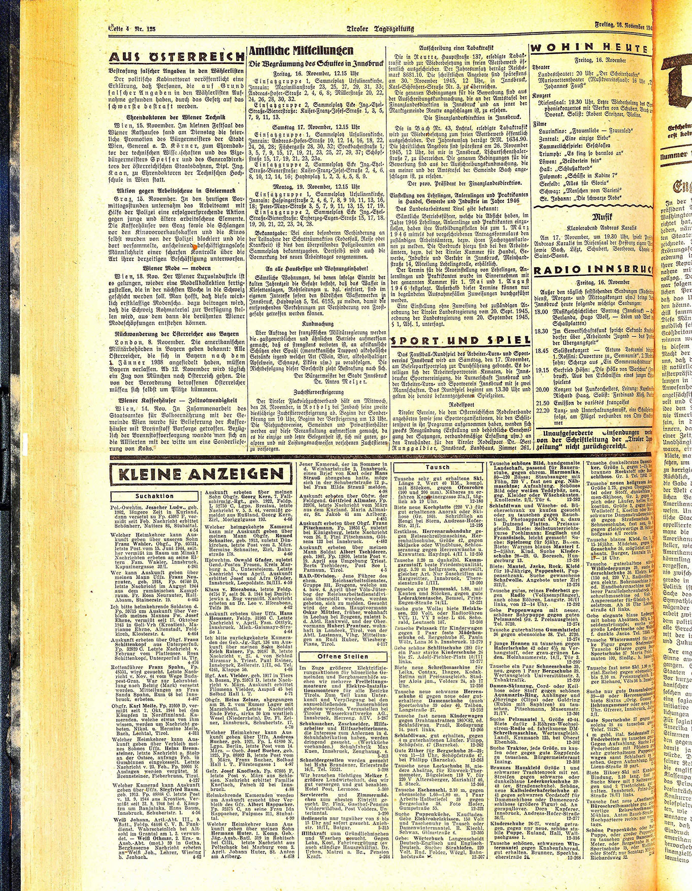 Auskunft erbeten über Obgf. Franz Pitschmann, Fp. 19851 C, zuletzt bei Königsberg, letzte Nachricht vom 26. 2. Fini Pitschmann, Götzens 123 bei Innsbruck. 4-482 Auskunft erbeten über meinen Mann Soldat Albert Tschiderer, geb. 1907, Fp. 12890, letzte Post v. 19. April aus Umgebung Triest. Berta Tschiderer, Post See i. Paznaun, Tirol. 4-5