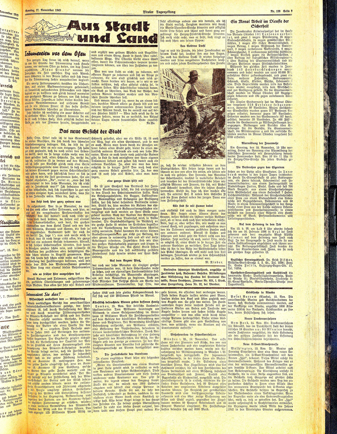 sieht allerdings anders aus wie damals, als ich die Stadt verließ. Langsam wandern wir durch die Maria=Theresien=Straße hinunter und plötzlich bleibt Otto stehen und schaut und starrt ganz angestrengt die Herzog=Friedrich=Straße hinunter. Ich weiß nicht recht, was er sieht, doch ringt es sich auch schon von seinen Lippen: