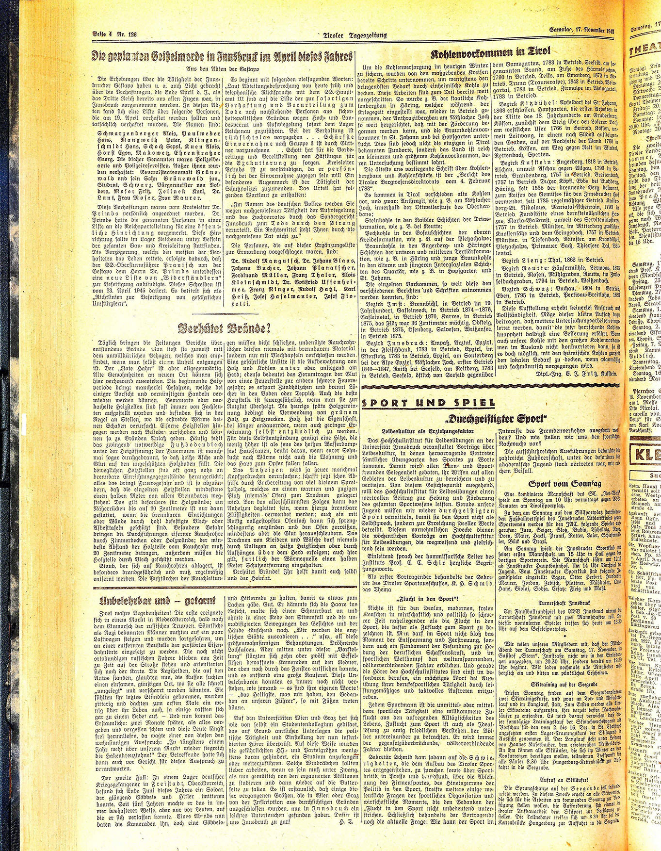 Die Erhebungen über die Tätigkeit der Innsbrucker Gestapo haben u. a. auch Licht gebracht über die Verhaftungen, die Ende April d. J., als das Dritte Reich bereits aus allen Fugen war, in Innsbruck vorgenommen wurden. In diesen Akten fand sich eine Liste über folgende Personen, die am 19. Avril verhaftet werden sollten und tatsächlich verhaftet wurden. Die Namen sind: Schwarzenberger Alois, Paulweber Hans, Mangweth Peter, Klingenschmidt Hans, Schoch Seppl, Kuen Alois, Horst Egon, Makowetz, Ehrenstraßer Georg. Die bisher Genannten waren Polizeibeamte und Polizeireservisten. Außer ihnen wurden verhaftet: Generalstaatsanwalt Grünewald und sein Sohn Grünewald jun., Student, Schwarz, Bürgermeister von Volders, Moser Fritz, Jelinek Karl, Dr. Lunt, Frau
