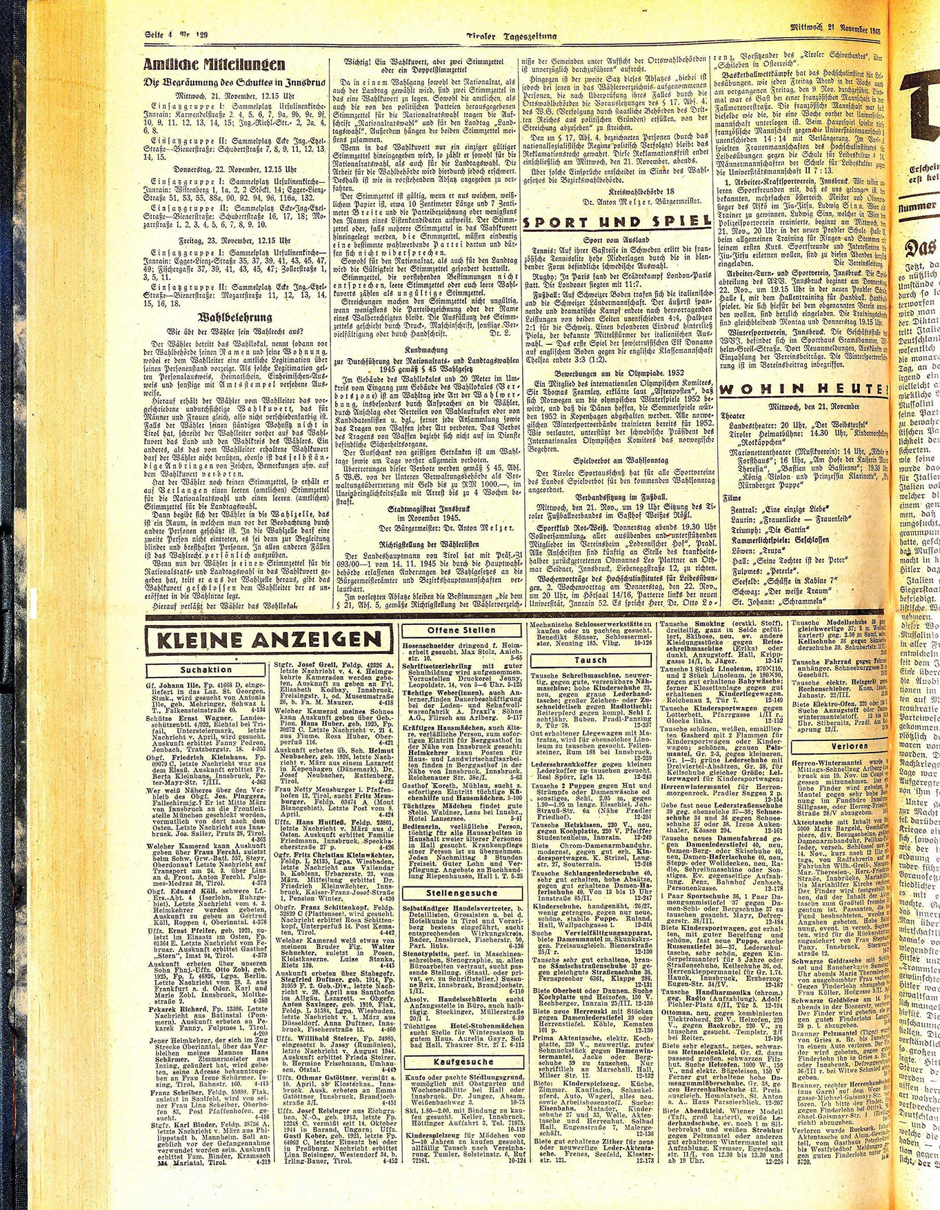 Schütze Ernst Wagner, Landesschützenbtl. 4/922, Eichtal bei Trifail, Untersteiermark, letzte Nachricht v. April, wird gesucht. Auskunft erbittet Fanny Pedron, Jenbach, Tratzbergstr. 18. 4-353 Obgf. Friedrich Kleinhans, Fp. 09079 C, letzte Nachricht war aus dem Elsaß. Auskunft erbittet Fr. Berta Kleinhans, Innsbruck, Peter-Mayr-Str. 7/III. 4-363