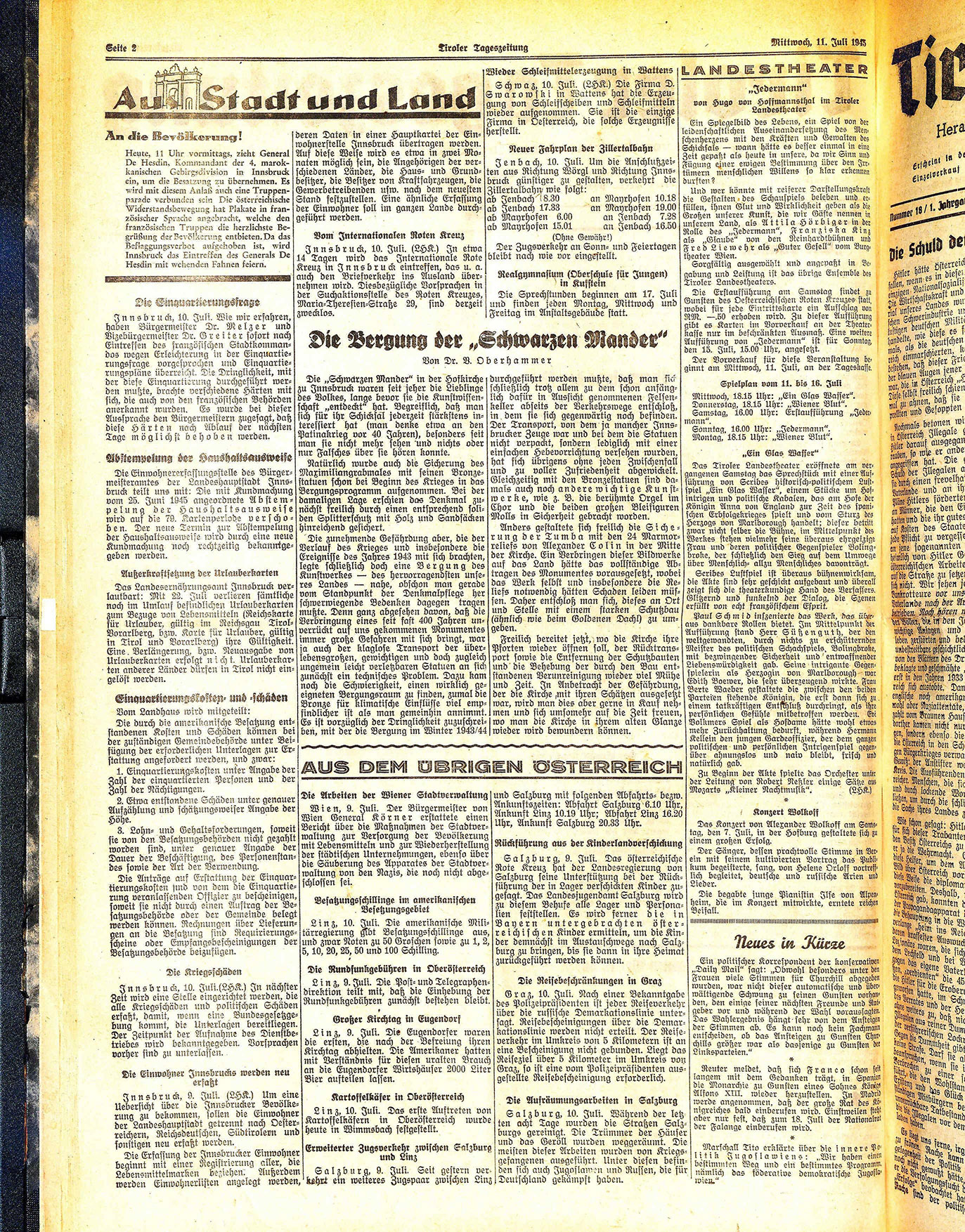Heute, 11 Uhr vormittags, zieht General De Hesdin, Kommandant der 4, marokkanischen Gebirgsdivision in Innsbruck ein, um die Besatzung zu übernehmen. Es wird mit diesem Anlaß auch eine Truppenparade verbunden sein Die österreichische Widerstandsbewegung hat Plakate in französischer Sprache angebracht, welche den französischen Truppen die herzlichste Begrüßung der Bevölkerung entbieten. Da das Beflaggungsverbot aufgehoben ist, wird Innsbruck das Eintreffen des Generals De Hesdin mit wehenden Fahnen feiern.