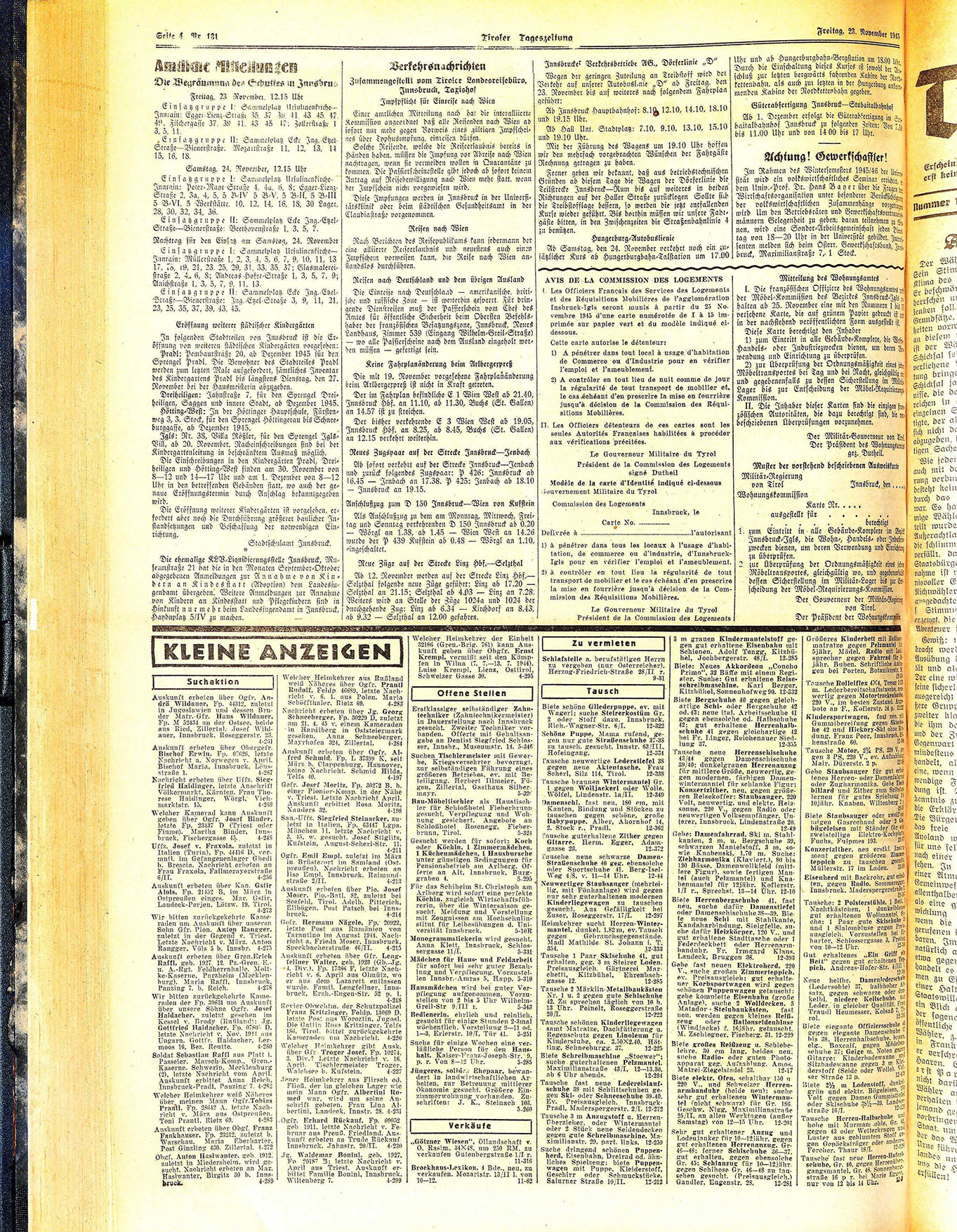 Pradl: Pembaursträße 20, ab Dezember 1945 für den Sprengel Pradl. Die Bewohner des Stadtteiles Pradl werden zum letzten Male aufgefordert, sämtliches Inventar des Kindergartens Pradl bis längstens Dienstag, den 27. November bei der Hausmeisterin abzugeben.
