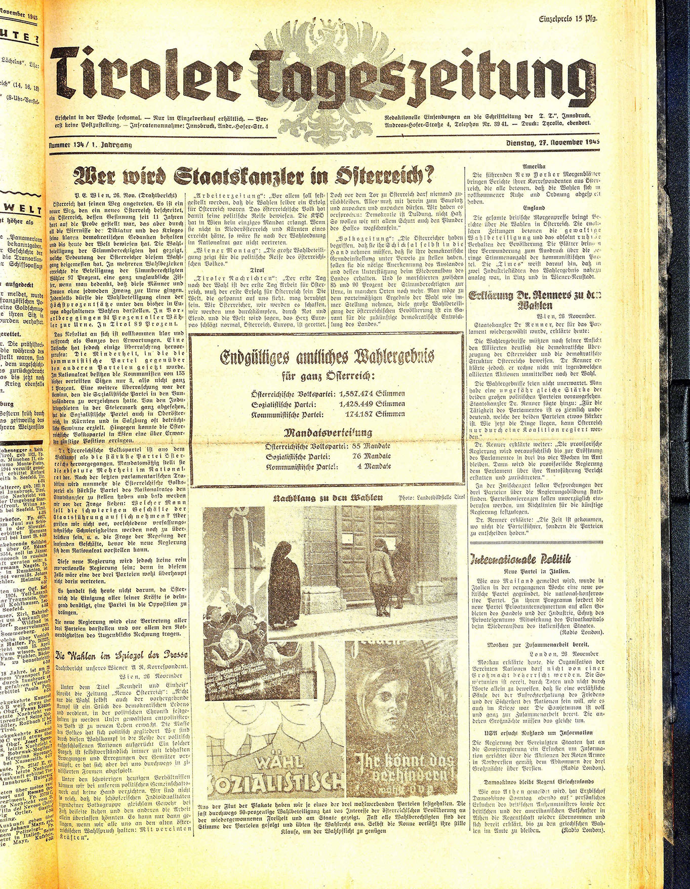 „Tiroler Nachrichten": „Der erste Tag nach der Wahl ist der erste Tag Arbeit für Österreich, muß der erste Erfolg für Österreich sein Die Welt, die gespannt auf uns sieht. mag beruhigt sein. Wir Österreicher, wir werden es schaffen. wir werden uns durchkämpfen, durch Not und Elend, und die Welt wird sagen, das Herz Europas schlägt normal, Österreich. Europa, ist gerettet.