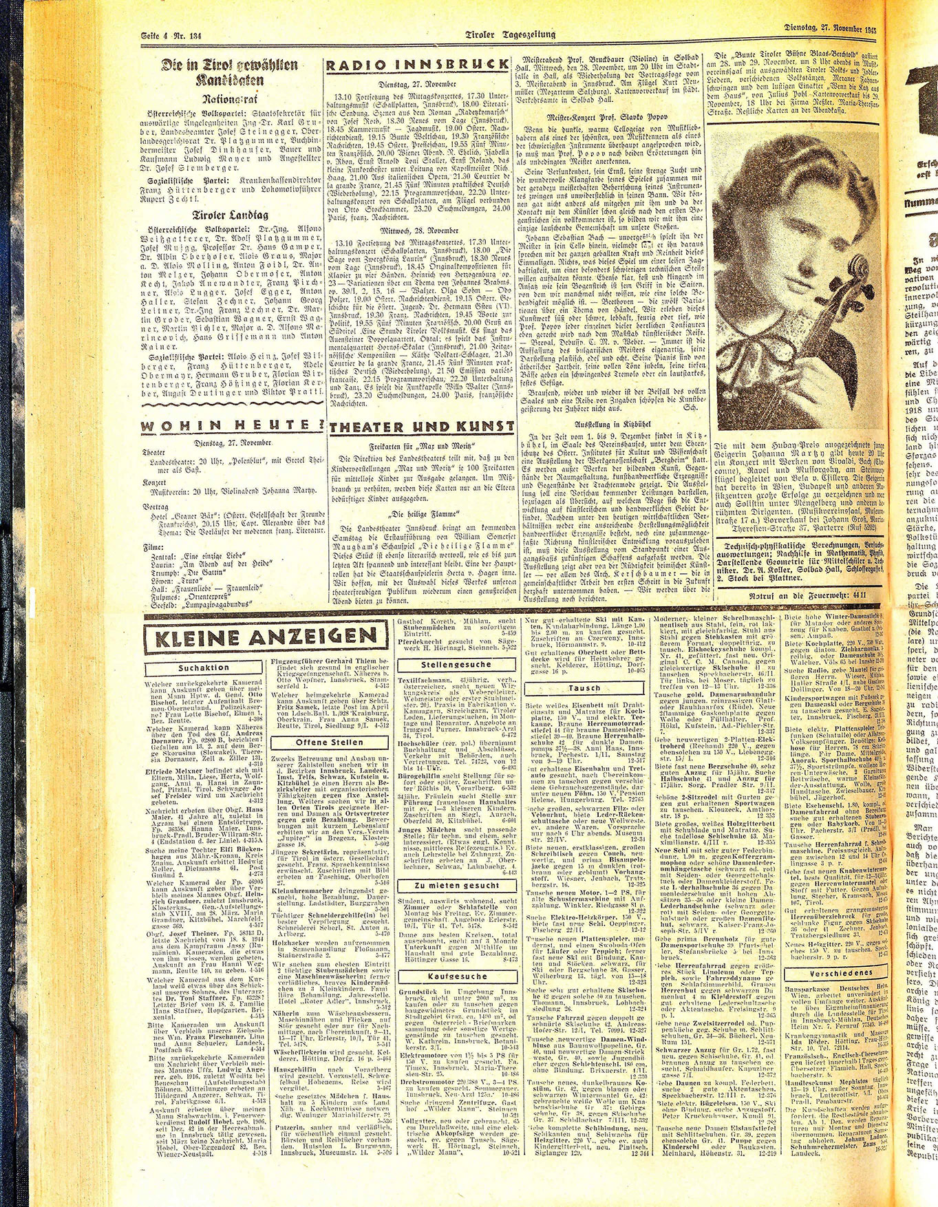 Meisterabend Prof. Bruckbauer (Violine) in Solbad Hall. Mittwoch, den 28. November, um 20 Uhr im Stadtfalle in Hall, als Wiederholung der Vortragsfoge vom 3. Meisierabend in Innsbruck. Am Flügel Kurt Neumüller (Mozarteum Salzburg). Kartenvorverkauf im städt. Verkehrsamte in Solbad Hall.