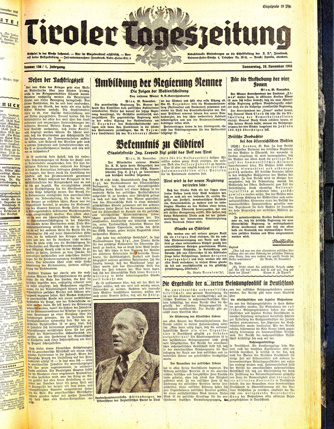 Daß das Tiroler Volk als der Typus eines freien Volkes durch diese Wahl bewiesen hat, daß es nach wie vor imstande ist, ererbte Begriffe von Freiheit, demokratischem Verständnis, Vaterlandsliebe zu wahren und im unbedingten Glauben an den Aufbau eines freien, glücklicheren Österreich heranzugehen, hat uns mit tiefster Genugtnung erfüllt. Wir hoffen, daß dieses Bekenntnis Tirols auch bei der Zusammensetzung der kommenden Staatsregierung einen Ausdruck finden wird.