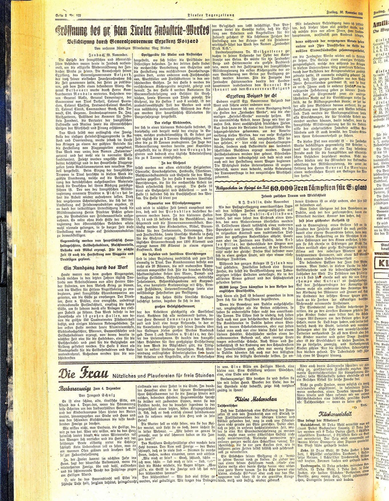 Die Spitzen der französischen und österreichischen Behörden waren heute in Jenbach versammelt, um die offizielle Wiedereröffnung der Jenbacher Werke zu feiern. Die Anwesenheit seiner Exzellenz, des Generalgouverneurs Voizard, der trotz seiner vielfachen Inanspruchnahme sich die Zeit genommen hatte, der Feier zu präsidieren, gab dem Feste einen besonderen Glanz. General Bethouart wurde durch Herrn Kommandanten Mondain vertreten. Außerdem waren General Molle, General Lamontagne, der Gouverneur von Tirol Dutheil, Colonel Pantachon, Colonel Chassey, Leutnant=Colonel Goussot, Lt. Colonel Clerck, Commandant Brech, Cdt. Davoust, Cdt. Sazerac, Landeshauptmann Dr. Ing. Weißgatterer, Präsident der Kammer für Industrie Foradori, die Vertreter der