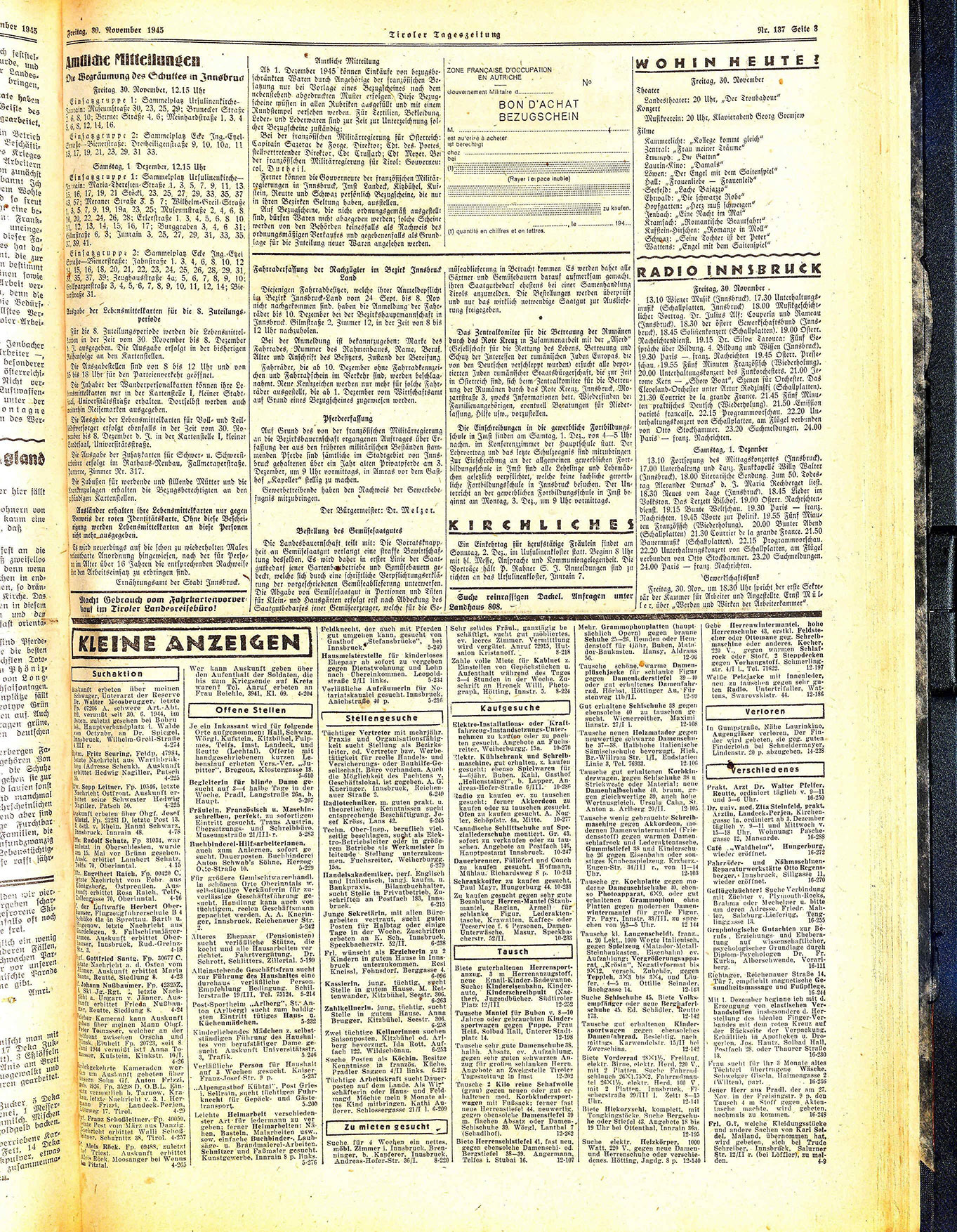 Ferner können die Bouverneure der französischen Militärregierungen in Innsbruck, Imst Landeck, Kitzbühel, Kufstein, Reutte und Schwaz persönlich Bezugscheine, die nur in ihren Bezirken Geltung haben, ausstellen.