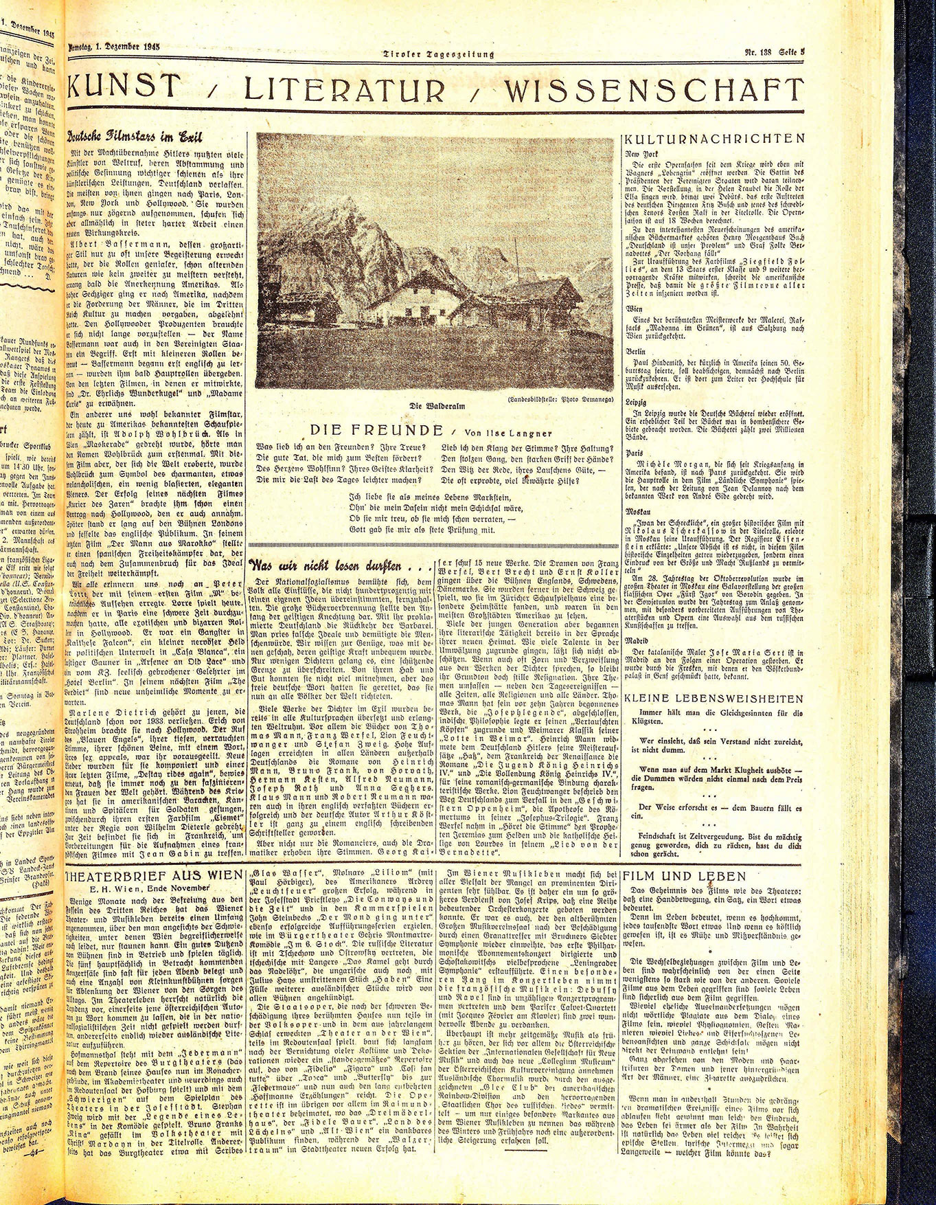 E. H. Wien, Ende November Wenige Monate nach der Befreiung aus den Fesseln des Dritten Reiches hat das Wiener theater= und Musikleben bereits einen Umfang angenommen, über den man angesichts der Schwieigkeiten, unter denen Wien begreiflicherweise noch leidet, nur staunen kann. Ein gutes Dutzend von Bühnen sind in Betrieb und spielen täglich. die fünf hauptsächlich in Betracht kommenden konzertsäle sind fast für jeden Abend belegt und auch eine Anzahl von Kleinkunstbühnen sorgen für Ablenkung der Wiener von den Sorgen des Altags. Im Theaterleben herrscht natürlich die undenz vor, einerseits jene österreichischen Autoten zu Wort kommen zu lassen, die in der nationalsozialistischen Zeit nicht gespielt werden durfien andererseits endlich wieder
