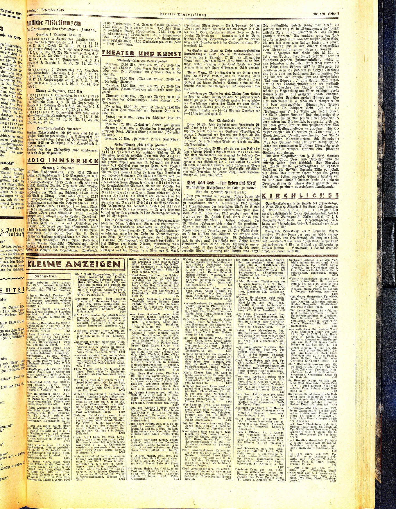 Zum zweitenmal im heurigen Jahre haben die Annalen von Wilten ein musikalisches Ereignis zu verzeichnen. Der 10. September 1945 brachte die Uraufführung der herrlichen Messe in C von Dr. Karl Scheidle, eines Schülers von Prof Karl Koch. Am 23. November 1945 wurden vom Chordirektor von St. Jakob Prof. Karl Koch zwei eigene Kompositionen zu Gehör gebracht, der 50. Pfalm „Erbarme dich meiner“ für gemischten Chor a capella op. 28 a und „Schmerzensreiche“ Frauenchor mit Orchester op. 23. Die Musik Koch: weist im Aufbau das Können der großen deutschen Meister des beginnenden 18. Jahrhunderts auf, ist aber auch beeinflußt vom Geiste Anton Bruckners. Was beide Werke besonders anziehend macht, ist ihre leichte Faßlichkeit, die wundervolle