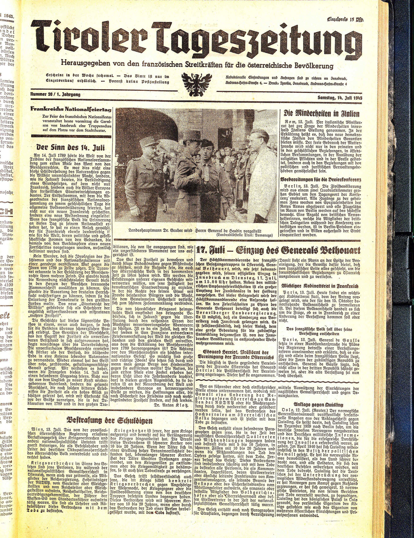 Der Höchstkommandierende der französischen Besatzungstruppen in Österreich, General Bethouart, wird, wie jetzt bekanntgegeben wird, seinen offiziellen Einzug in [Innsbruck am Dienstag, 17. Juli, um 15.00 Uhr halten. Neben den militärischen Empfangsfeierlichkeiten ist ein großer Empfang der Funktionäre in der Hofburg vorgesehen. Bei dieser Gelegenheit wird der Höchstkommandierende eine Ansprache halten. An den Feierlichkeiten zu Ehren des Generals Bethouart beteiligt sich auch die Vorarlberger Landesregierung. Es ist möglich, daß ein Sonderzug aus Vorarlberg nach Innsbruck gelangen wird. Es ist selbstverständlich, daß dieser Anlaß, dem eine große Bedeutung für die zukünftige Entwicklung beizumessen ist, von der Innsbrucker Bevölkerung in entsprechender Weise wahrgenommen wird.