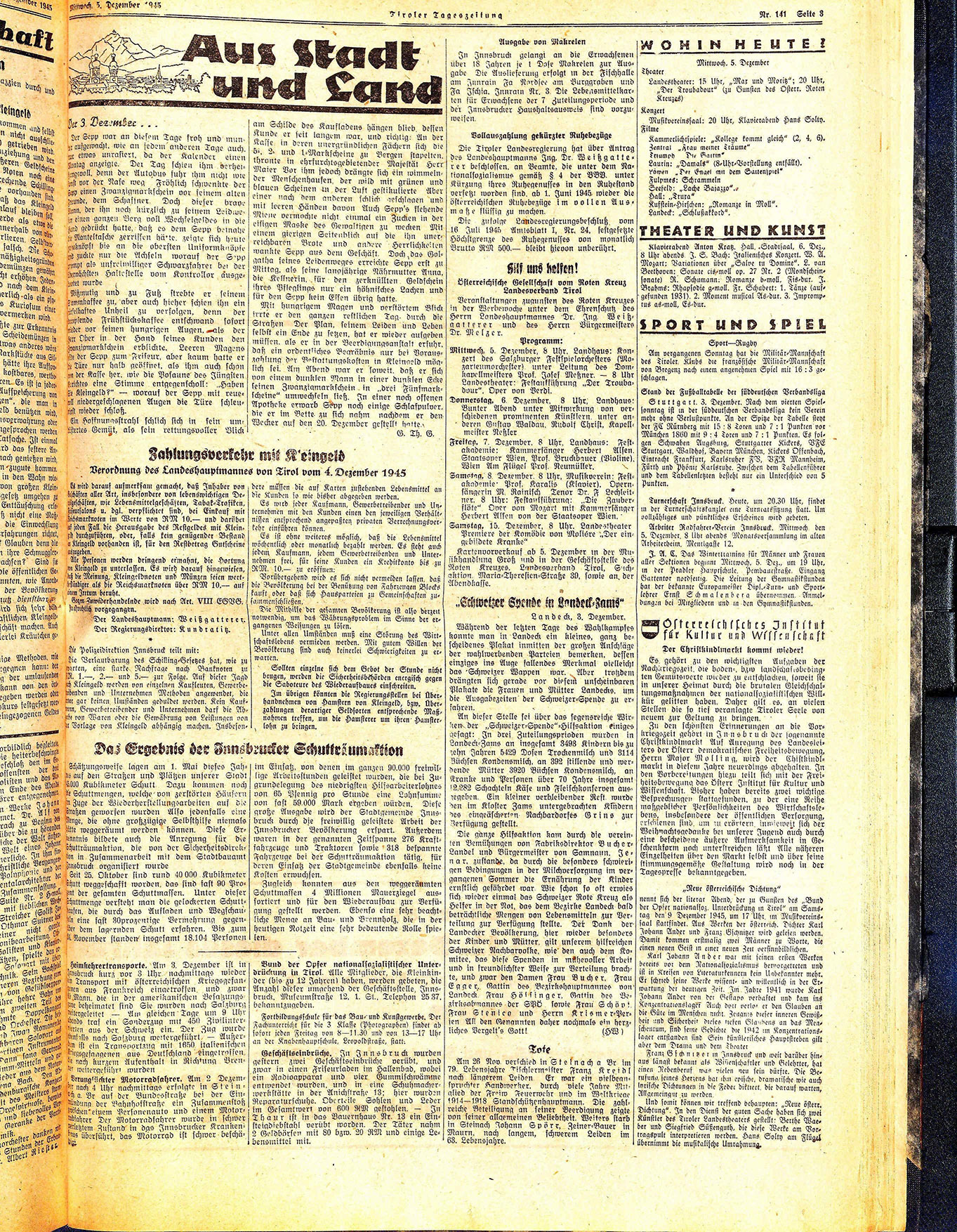 „Neue österreichische Dichtung“ nennt sich der literar Abend, der zu Gunsten des „Bund der Opfer nationalsoz. Unterdrückung in Tirol“ am Samstag den 9 Dezember 1945, um 17 Uhr. im Musikvereinssaal stattfindet. Aus Werken der österreich. Dichter Karl Johann Ander und Franz Gschnitzer wird gelesen werden. Damit kommen erstmalig zwei Männer zu Worte, die einen neuen Geist in einer neuen Zeit versinnbildlichen.