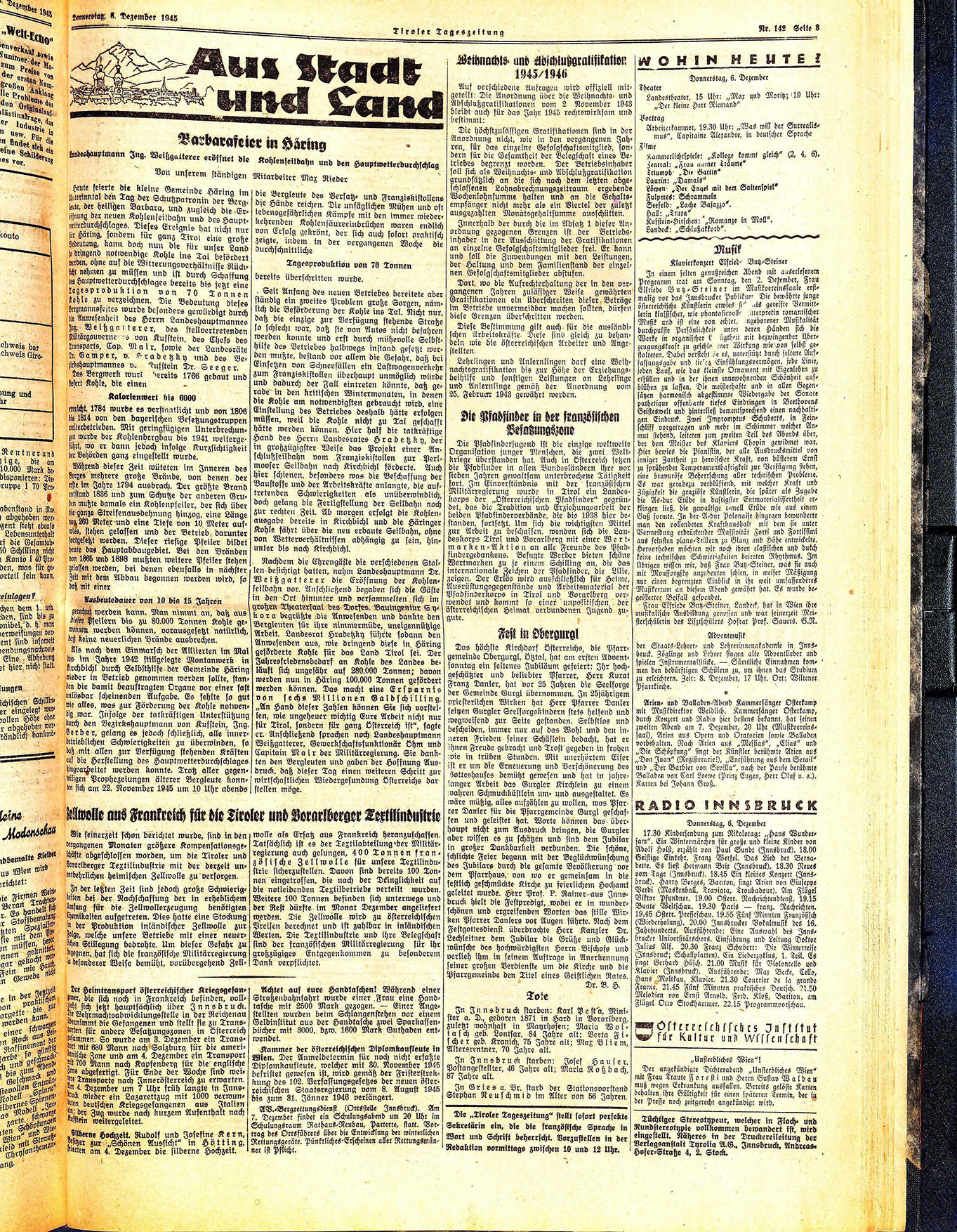 heute feierte die kleine Gemeinde Häring im Unterinntal den Tag der Schutzpatronin der Berglute, der heiligen Barbara, und zugleich die Erimnung der neuen Kohlenseilbahn und des Hauptnetterdurchschlages. Dieses Ereignis hat nicht nur Häring, sondern für ganz Tirol eine große bedeutung, kann doch nun die für unser Land #e dringend notwendige Kohle ins Tal befördert verden, ohne auf die Witterungsverhältnisse Rückscht nehmen zu müssen und ist durch Schaffung us Hauptwetterdurchschlages bereits bis jetzt eine kagesproduktion von 70 Tonnen kohle zu verzeichnen. Die Bedeutung dieses bergmannsfestes wurde besonders gewürdigt durch de Anwesenheit des Herrn Landeshauptmannes ug Weißgaiterer, des stellvertretenden Rilitärgouvernes von Kufstein, des