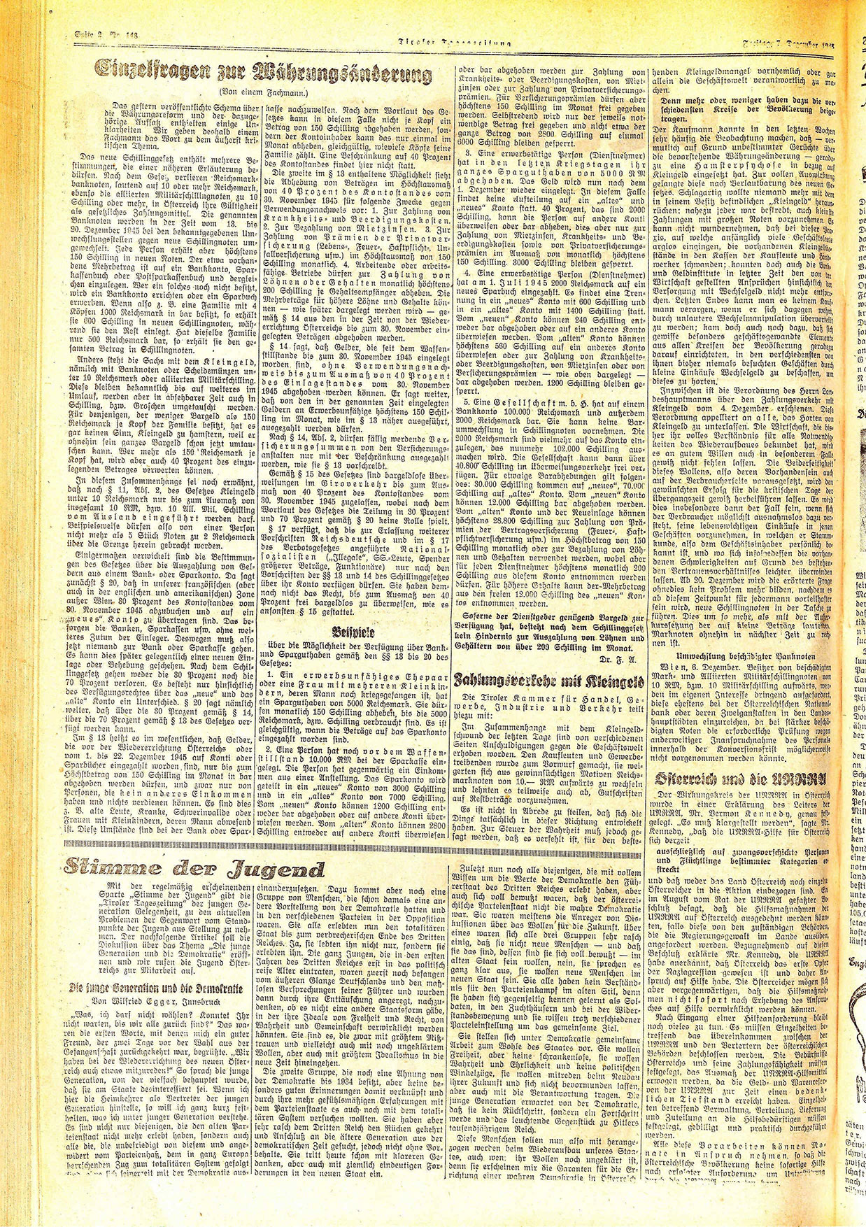 Mit der regelmäßig erscheinenden Sparte „Stimme der Jugend“ gibt die „Tiroler Tageszeitung“ der jungen Generation Gelegenheit, zu den aktuellen Problemen der Gegenwart vom Standpunkte der Jugend aus Stellung zu nehmen. Der nachfolgende Artikel soll die Diskussion über das Thema „Die junge Generation und die Demokratie“ eröffnen und wir rufen die Jugend Österreichs zur Mitarbeit auf.
