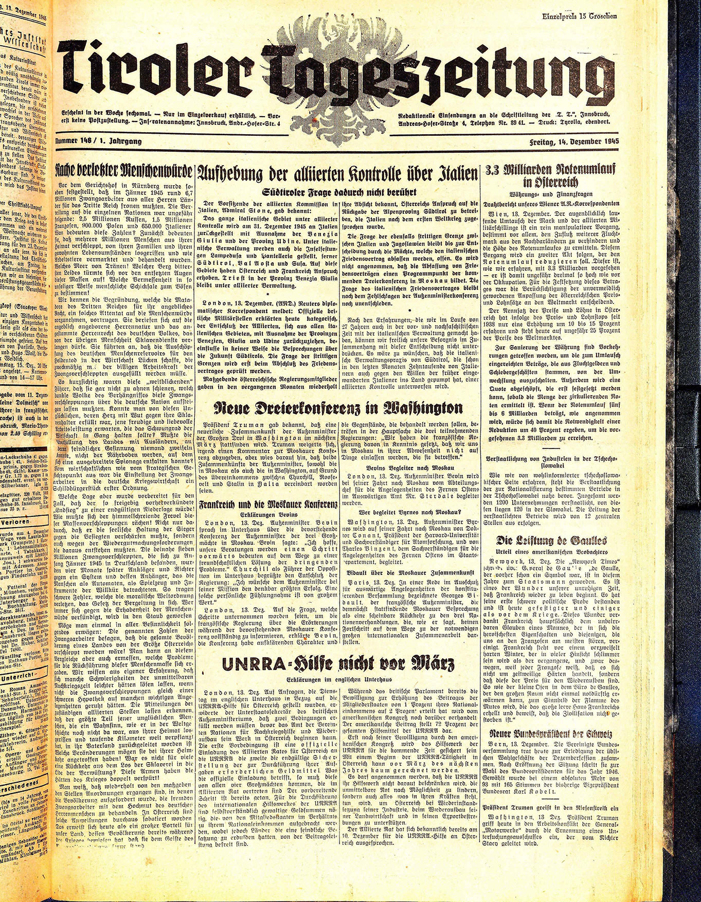 Nach den Erfahrungen, die wir im Laufe von 27 Jahren auch in der vor= und nachfaschistischen Zeit mit der italienischen Verwaltung gemacht haben, können wir freilich unsere Besorgnis im Zusammenhang mit dieser Entscheidung nicht unterdrücken. Es wäre zu wünschen, daß die italienische Verwaltungspraxis von Südtirol, die schon in den letzten Monaten Zehntausende von Italienern auch gegen den Willen der früher eingewanderten Italiener ins Land gepumpt hat, einer alliierten Kontrolle unterworfen wird.