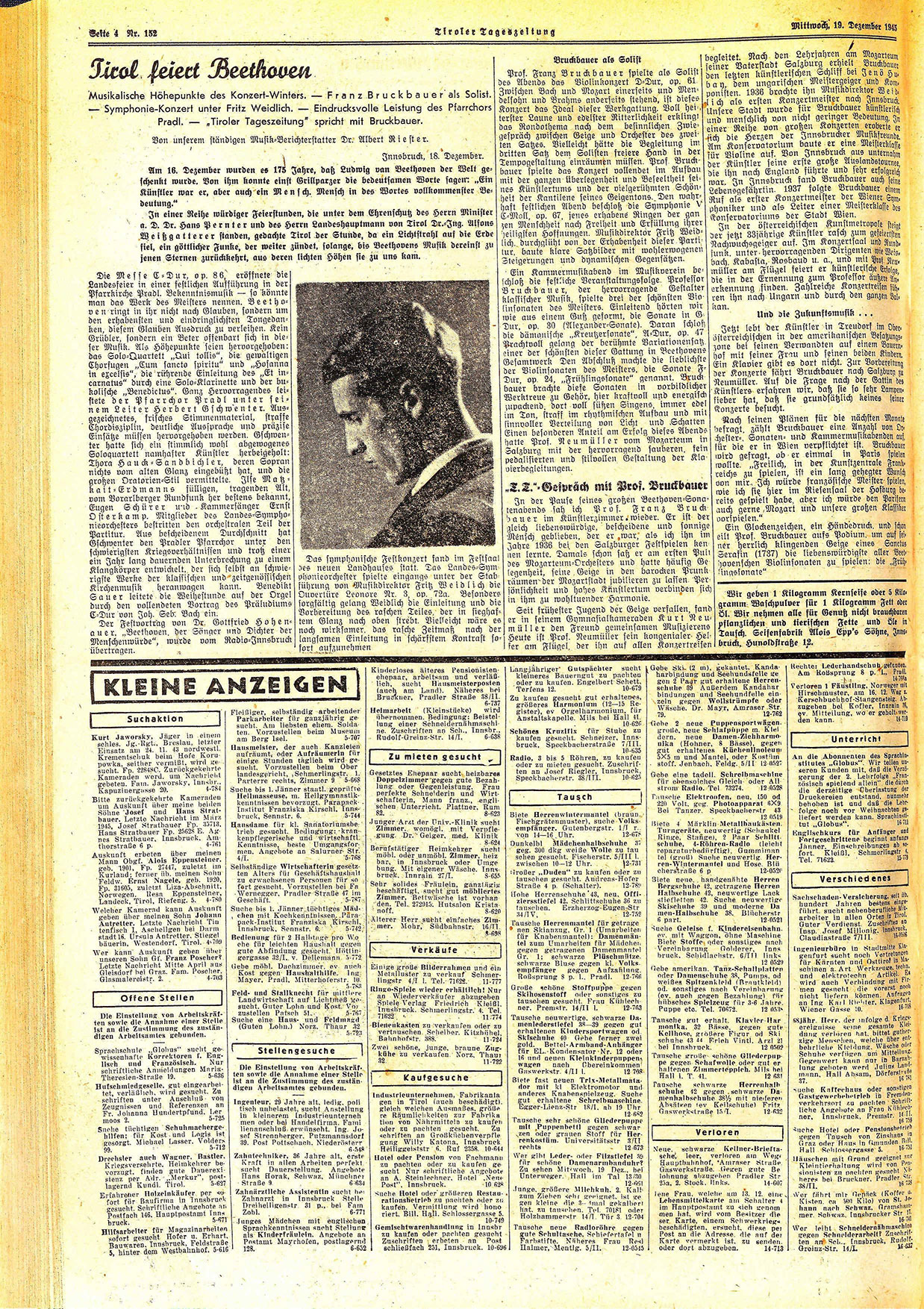 Der Festvortrag von Dr. Gottfried Hohenauer. „Beethoven, der Sänger und Dichter der Menschenwürde“, wurde vom Radio=Innsbruck übertragen.