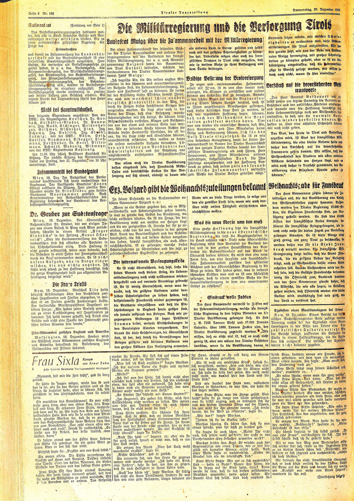 Der Herr Gouverneur zählte sodann die Zuteilungen auf, die der Bevölkerung aus Anlaß des Weihnachtsfestes zugute kommen. Außerdem werden der Tiroler Regierung 18.000 sten, die Eigentum Frankreichs sind, zur Verfügung gestellt werden. Es sind dies 18.000 Kisten des französischen Roten Kreuzes, bestimmt für französische Kriegsgefangene, die jedoch nicht mehr für diesen Zweck zur Verteilung gelangen brauchen. Es ist diese Menge nicht groß genug, um ganz Tirol zu beschenkon, sie werden daher nur für die Stadt Innsbruck verteilt werden. Die französische Mili tärregierung sorgt dafür, daß die Stadt Innsbruck, die die größten Lasten der Besatzung trägt, auch zu Weihnachten dafür etwas Gutes erhalten soll. Gerade Weihnachten wird der Anlaß sein, daß die