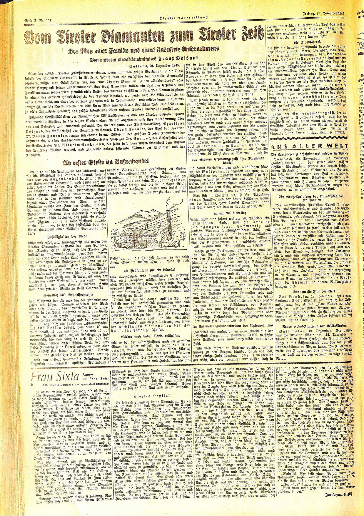 Eines der größten Tiroler Industrieunternehmen, wenn nicht das größte überhaupt, ist die Glasfahrik der Gebrüder Swarovski in Wattens. Wollte man die Geschichte der Familie Swarovski schildern, müßte man Schriftsteller sein, wie etwa Thomas Mann mit seinen „Buddenbroks“ oder Rudolf Herzog mit seinen „Stolienkamps“. Das Buch Swarovski würde ein ähnlicher Erfinder= und Familienroman, wobei Tirol ziemlich viele Seiten des Werkes ausfüllen müßte. Der Roman begänne in einem der größten Industriebezirke der Tschechoslowakei, wo heute noch die Glasindustrie an erster Stelle steht, am Ende des vorigen Jahrhunderts in Johannesthal, und würde dann in Wattens fortgesetzt, wo die Tyrolit=Werke seit 1904 ihren Platz innerhalb der tirolischen Industrie behaupten. ja