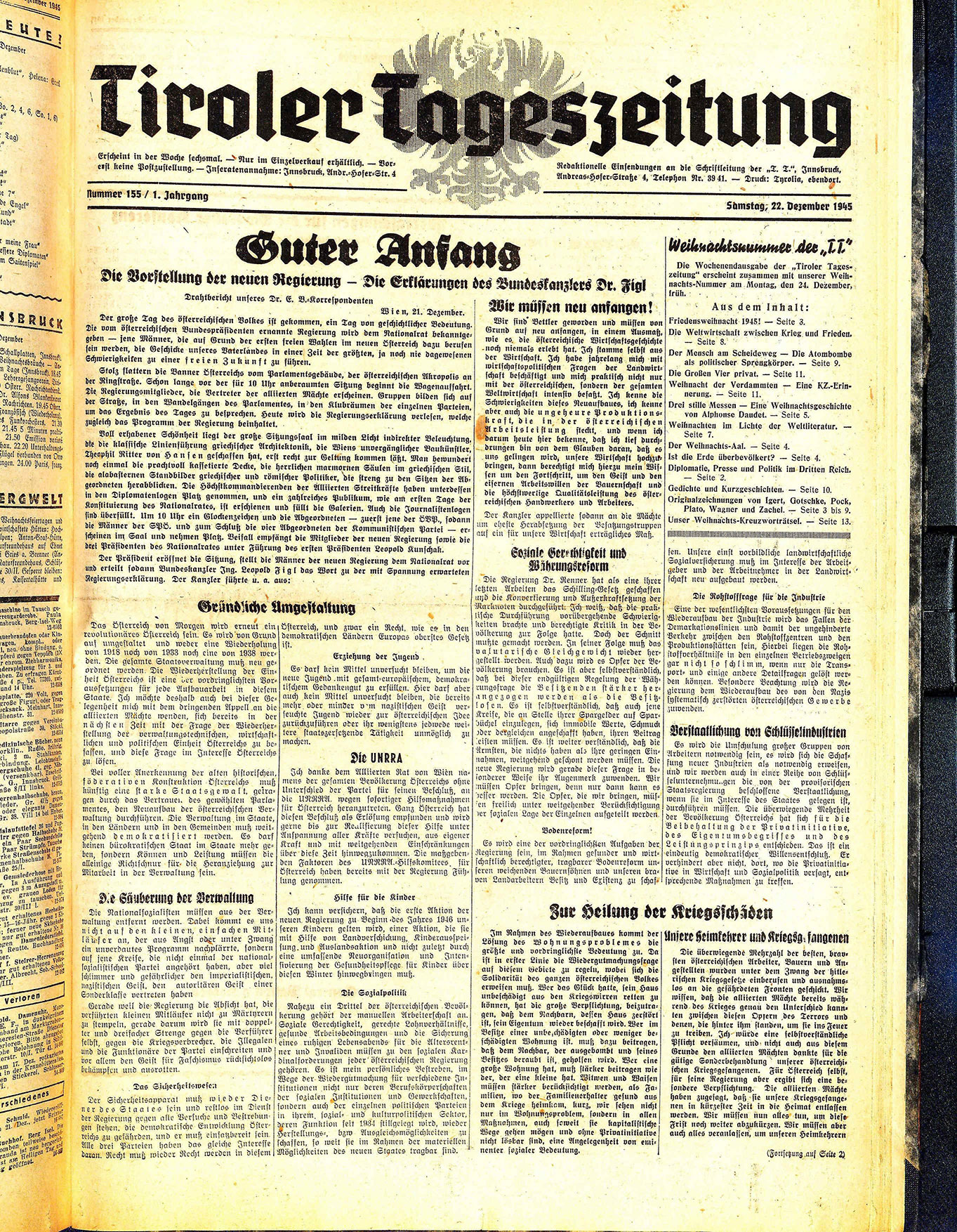 Die vom österreichischen Bundespräsidenten ernannte Regierung wird dem Nationalrat bekanntgegeben — jene Männer, die auf Grund der ersten freien Wahlen im neuen Österreich dazu berufen sein werden, die Geschicke unseres Vaterlandes in einer Zeit der größten, ja noch nie dagewesenen Schwierigkeiten zu einer freien Zukunft zu führen.