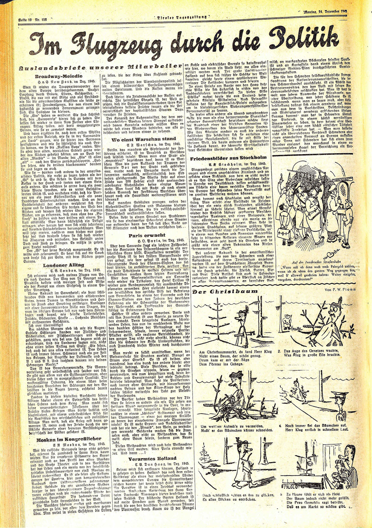 H. O. Paris, im Dez. 1945. über dem Concorde liegt ein leichter Frühnebel. der die Konturen des Triumphbogens in ein versöhnliches Grau hüllt. Einzelheiten verwischt. Der große Platz ist in der frühen Morgenstunde wie leer gefegt, wie leer gefegt ist auch das breite. schnurgerade Band der Champs=Elysees, das sich dort hinten, im entblätterten Bois, verliert.. Nur. ein paar Schutzleute in weißen Helmen und mit Leuchtstäben machen ihren letzten Kontrollgang über dem Marineministerium am Concorde weht wieder die Trikolore. das Hotel Crillon ist wieder zum Rendezvousplatz für ausländische Diplomaten geworden Hier vielleicht kommt einem am deutlichsten das optische Bild der Befreiung zum Bewußtsein, da einem der Concorde und die Chamns-Elosees aus den