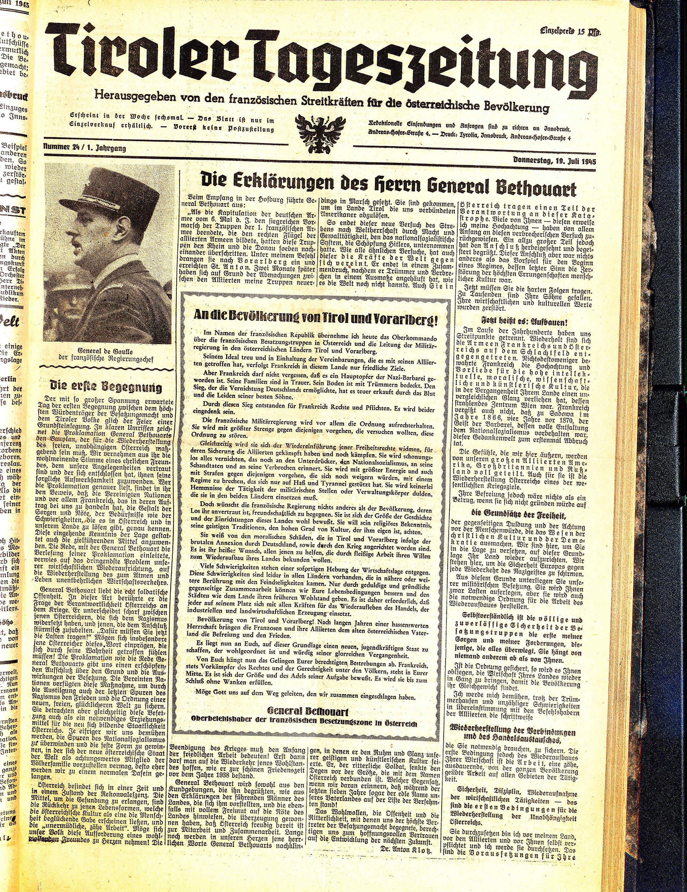 Der mit so großer Spannung erwartete Tag der ersten Begegnung zwischen dem höchsten Würdenträger der Besatzungsmacht und dem Tiroler Volke glich der Feier einer Grundsteinlegung. In klaren Umrissen zeichnet die Proklamation General Bethouarts den Bauplan, der für die Wiederherstellung des freien, unabhängigen Österreich maßgebend sein muß. Wir vernehmen aus ihr die wohlmeinende Stimme eines ehrlichen Freundes, dem unsere Angelegenheiten vertraut sind und der sich entschlossen hat, ihnen seine sorgliche Aufmerksamkeit zuzuwenden. Wer die Proklamation genauer liest, findet in ihr den Beweis, daß die Vereinigten Nationen und vor allem Frankreich, das in deren Auftrag bei uns zu handeln hat, die Gestalt der Sorgen und Nöte, der Bedürfnisse wie der Schwierigkeiten, die es in Österreich und in unserem Lande