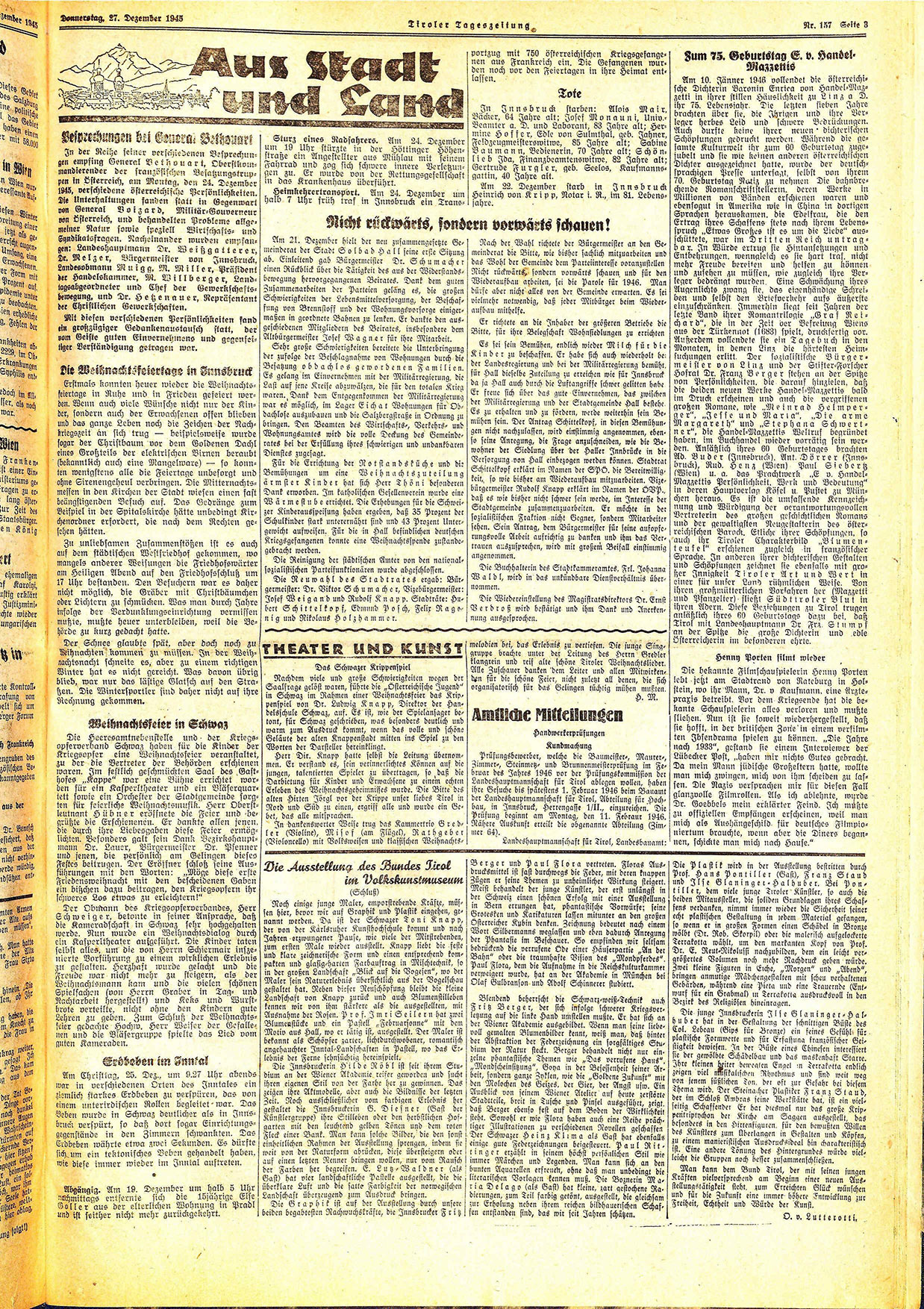 Erstmals konnten heuer wieder die Weihnachtsfeiertage in Ruhe und in Frieden gefeiert werden. Wenn auch viele Wünsche nicht nur der Kinder, sondern auch der Erwachsenen offen blieben und das ganze Leben noch die Zeichen der Nachkriegszeit an sich trug — beispielsweise wurde sogar der Christbaum vor dem Goldenen Dachl eines Großteils der elektrischen Birnen beraubt (bekanntlich auch eine Mangelware) — so konnten wenigstens alle die Feiertage unbesorgt und ohne Sirenengeheul verbringen. Die Mitternachtsmessen in den Kirchen der Stadt wiesen einen fast beängstigenden Besuch auf. Das Gedränge zum Beispiel in der Spitalskirche hätte unbedingt Kirchenordner erfordert, die nach dem Rechten gesehen hätten.