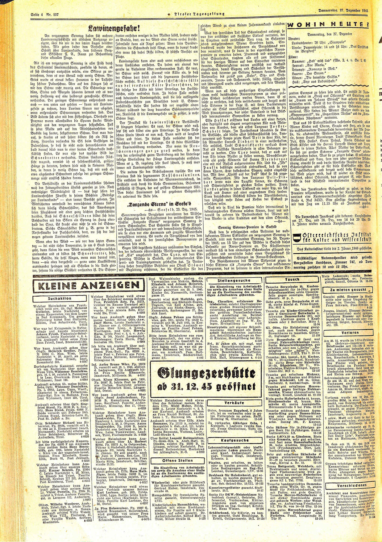 Nach dem so erfolgreichen ersten Auftreten der weltbekannten Wiener Eiskünstler am vergangenen Sonntag in Seefeld, tritt nun kommenden Sonntag, den 30. Dezember 1945, um 13 Uhr auf dem Wildsee in Seefeld dieses Ensemble zur Revue=Premiere an. Die Künstlertruppe verstand sich in dem einmaligen Schaulaufen glänzend einzuführen und vermittelte dabei einen Vorgeschmack für die bevorstehenden Leistungen im Revue=Erstauftreten.