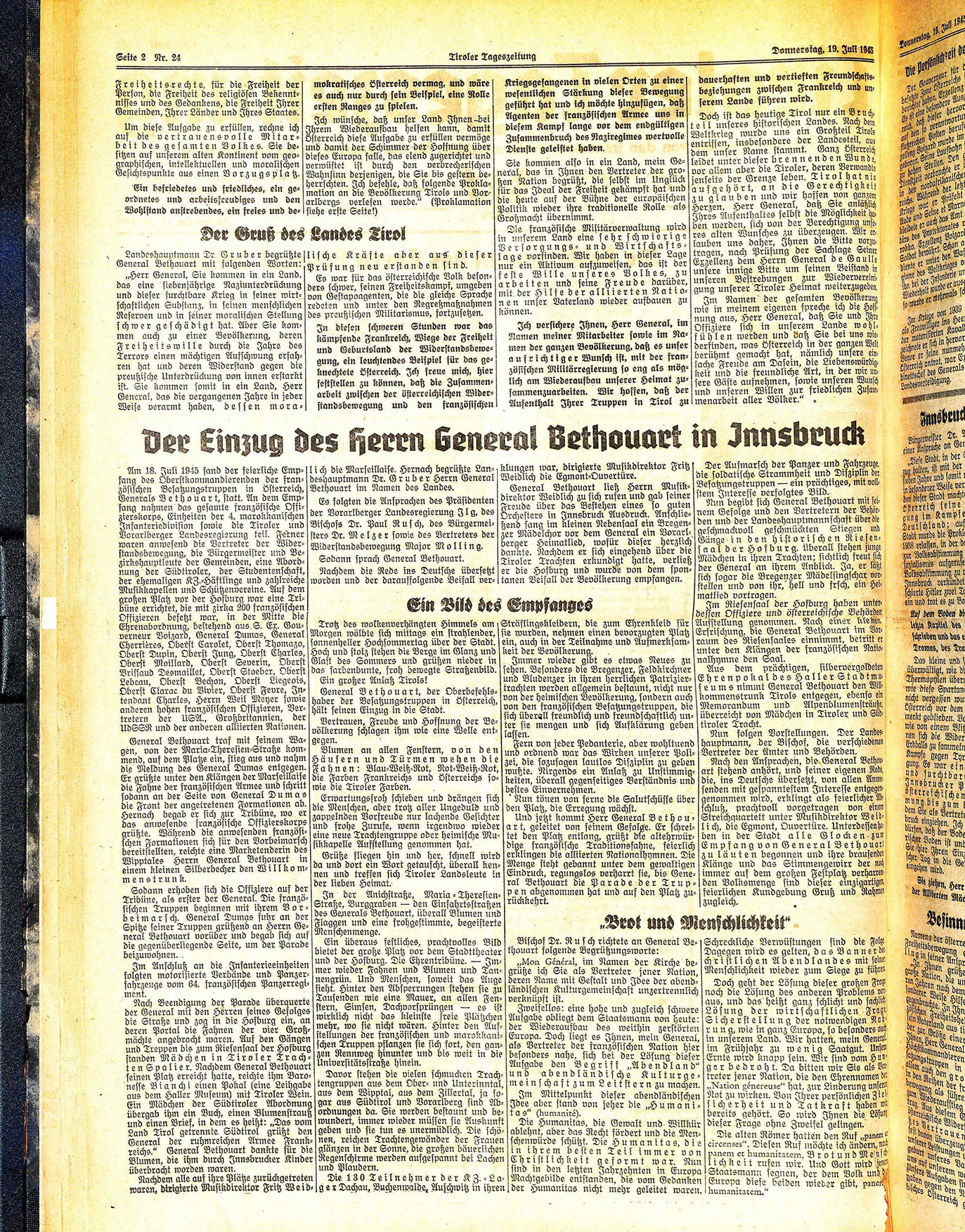 Ich versichere Ihnen, Herr General, im Namen meiner Mitarbeiter sowie im Namen der ganzen Bevölkerung, daß es unser aufrichtiger Wunsch ist, mit der französischen Militärregierung so eng als möglich am Wiederaufbau unserer Heimat zusammenzuarbeiten. Wir hoffen, daß der Aufenthalt Ihrer Truppen in Tirol zu