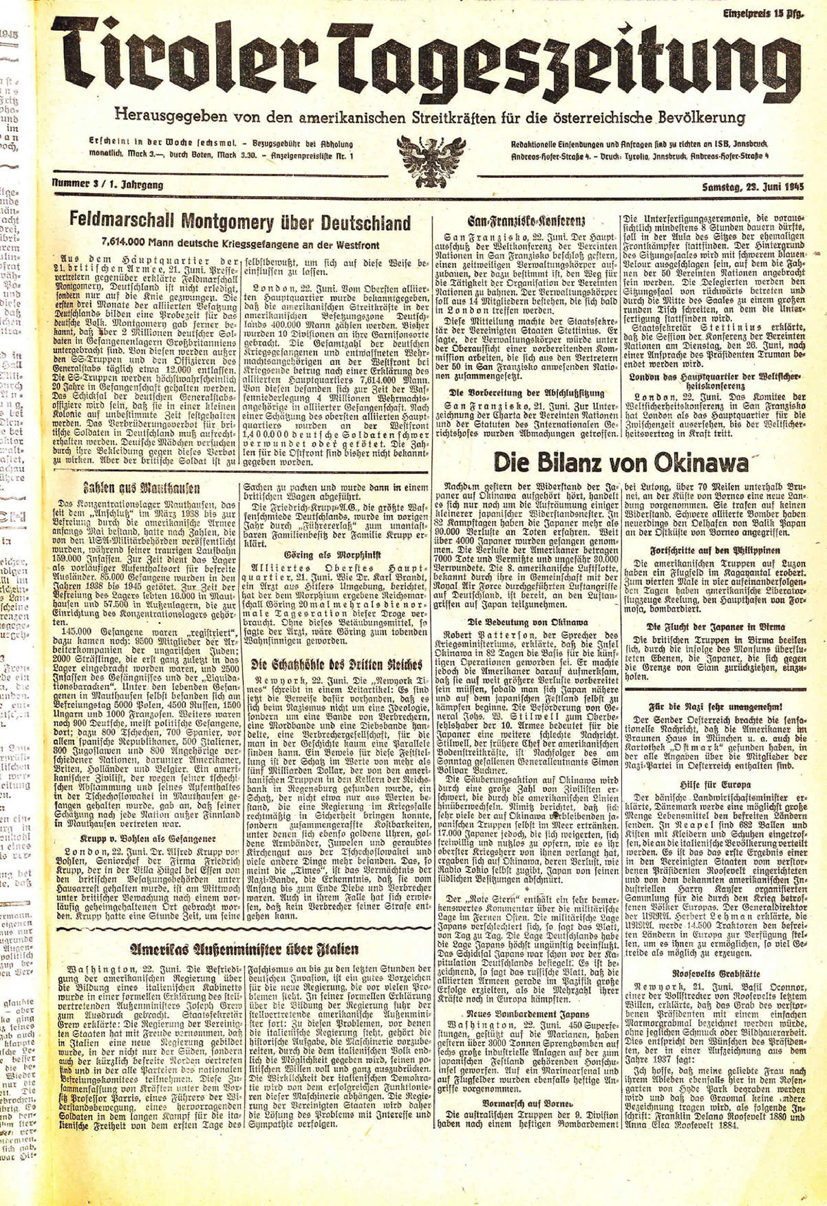 Aus dem Häuptquartier der 21 britischen Armee, 21. Juni. Presse, vertretern gegenüber erklärte Feldmarschall Montgomery, Deutschland ist nicht erledigt, sondern nur auf die Knie gezwungen. Die ersten drei Monate der alliierten Besatzung Deutschlands bilden eine Probezeit für das deutsche Volk. Montgomery gab ferner bekannt, daß über 2 Millionen deutscher Soldaten in Gefangenenlagern Großbritanniens untergebracht sind. Von diesen werden außer den SS=Truppen und den Offizieren des Generalstabs täglich etwa 12.000 entlassen. Die SS=Truppen werden höchstwahrscheinlich 20 Jahre in Gefangenschaft gehalten werden. Das Schicksal der deutschen Generalstabsoffiziere wird sein, daß sie in einer kleinen Kolonie auf unbestimmte Zeit festgehalten werden.
