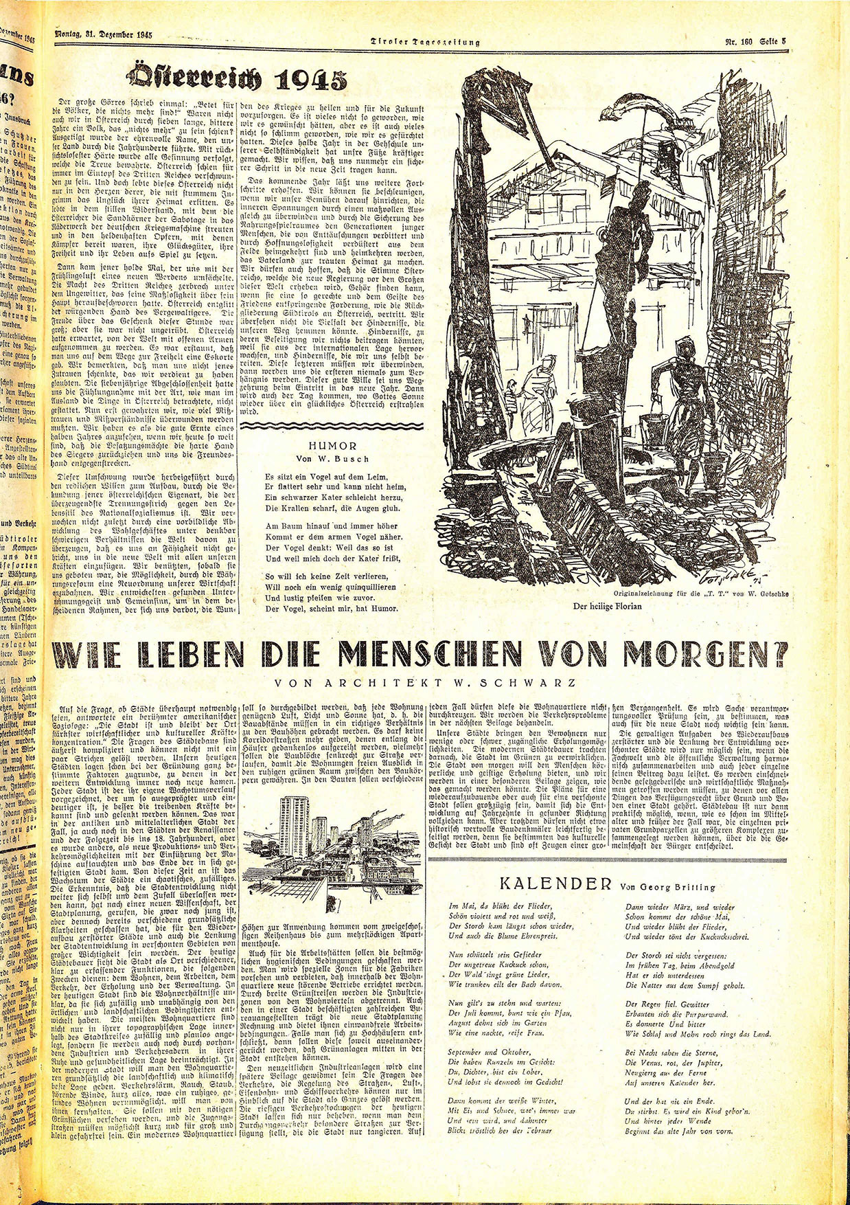 Unsere Städte bringen den Bewohnern nur wenige oder schwer zugängliche Erholungsmöglichkeiten. Die modernen Städtebauer trachten darnach, die Stadt im Grünen zu verwirklichen. Die Stadt von morgen will den Menschen körperliche und geistige Erholung bieten, und wir werden in einer besonderen Beilage zeigen, wie das gemacht werden könnte. Die Pläne für eine wiederaufzubauende oder auch für eine verschonte Stadt sollen großzügig sein, damit sich die Entwicklung auf Jahrzehnte in gesunder Richtung vollziehen kann. Aber trotzdem dürfen nicht etwa historisch wertvolle Baudenkmäler leichtfertig beseitigt werden, denn sie bestimmten das kulturelle Gesicht der Stadt und sind oft Zeugen einer gro