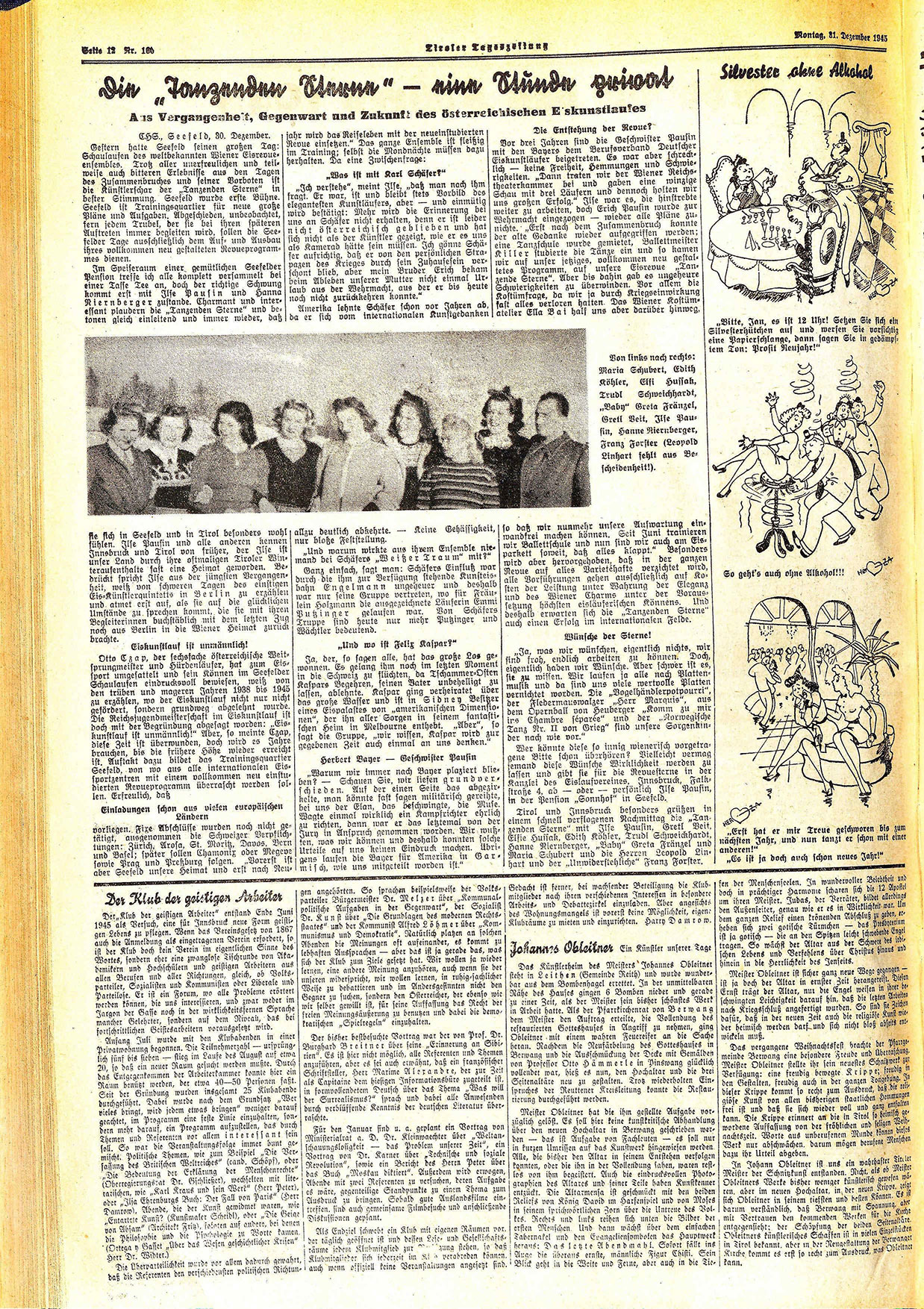 sie sich in Seefeld und in Tirol besonders wohl fühlen. Ilse Pausin und alle anderen kennen Innsbruck und Tirol von früher, der Ilse ist unser Land durch ihre oftmaligen Tiroler Winteraufenthalte fast eine Heimat geworden. Bedrückt spricht Ilse aus der jüngsten Vergangenheit, weiß von schweren Tagen des einstigen Eis=Künstlerquintetts in Berlin zu erzählen und atmet erst auf, als sie auf die glücklichen Umstände zu sprechen kommt, die sie mit ihren Begleiterinnen buchstäblich mit dem letzten Zug noch aus Berlin in die Wiener Heimat zurück brachte.