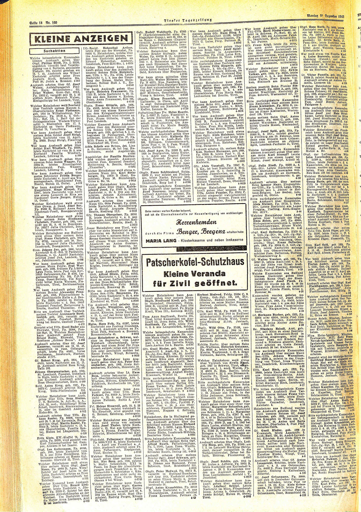 Fallschirmjäger Fw. Helnz Hagele, Fp. L 61617 E, Lgpa. Frankfurt a. M., letzte Nachricht v. 28. 10. 44 aus amerikan. Kriegsgelangenschaft in Frankreich. Um Auskunft bittet Fr. Maria Hagele, Prutz 71, Oberinntal. 4-0715 Welche zurückgekehrten Kameraden können Auskunft geben über Verbleib des Gefr. Kathrein Erwin, 2. Ers.- u. Ausb.-Batl. (M) 298, Edlingen, Untersteiermark, letzte Post v. 10. 3. Fam. Wokollinger, Galtür 72, Tirol. 4-0716 Sold. Josef Ager, Fp. 25203 D. geb. 1926 in Hopfgarten, letzte Nachr. v. 1. April aus Gegend Fiume (kroat. Grenze). Er war damals abgestellt, vermutlich an d. Ostfront. Um Auskunft bittet Ager Josef, Schornbauer, Hopfgarten, Tirol. 4-0717