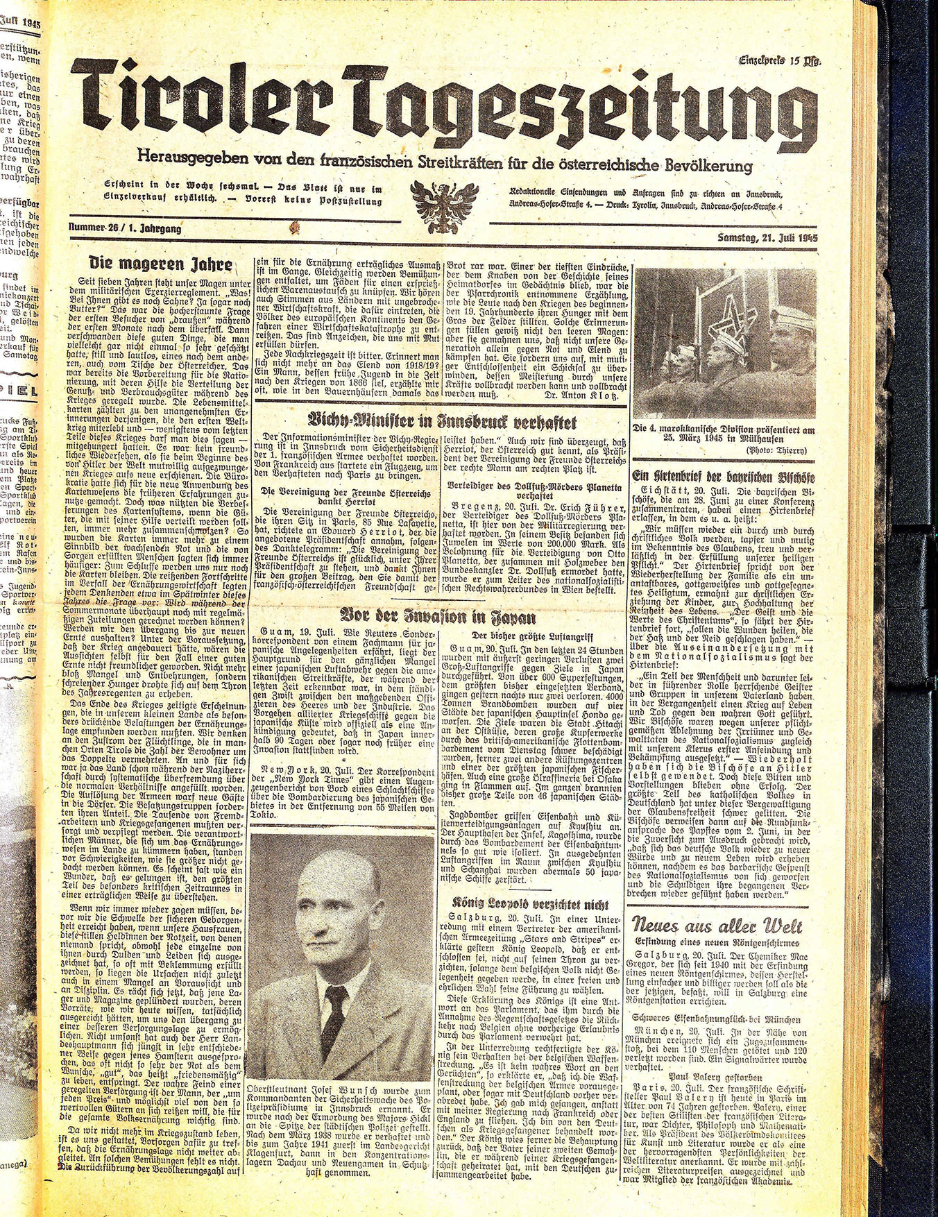 Das Ende des Krieges zeitigte Erscheinungen, die in unserem kleinen Lande als besonders drückende Belastungen der Ernährungslage empfunden werden mußten. Wir denken an den Zustrom der Flüchtlinge, die in manchen Orten Tirols die Zahl der Bewohner um das Doppelte vermehrten. An und für sich war ja das Land schon während der Naziherrschaft durch systematische überfremdung über die normalen Verhältnisse angefüllt worden. Die Auflösung der Armeen warf neue Gäste in die Dörfer. Die Besatzungstruppen forderten ihren Anteil. Die Tausende von Fremdkarbeitern und Kriegsgefangenen mußten versorgt und verpflegt werden. Die verantwortlichen Männer, die sich um das Ernährungswesen im Lande zu kümmern haben, standen vor Schwierigkeiten, wie sie größer nicht gedacht werden können. Es scheint fast wie ein