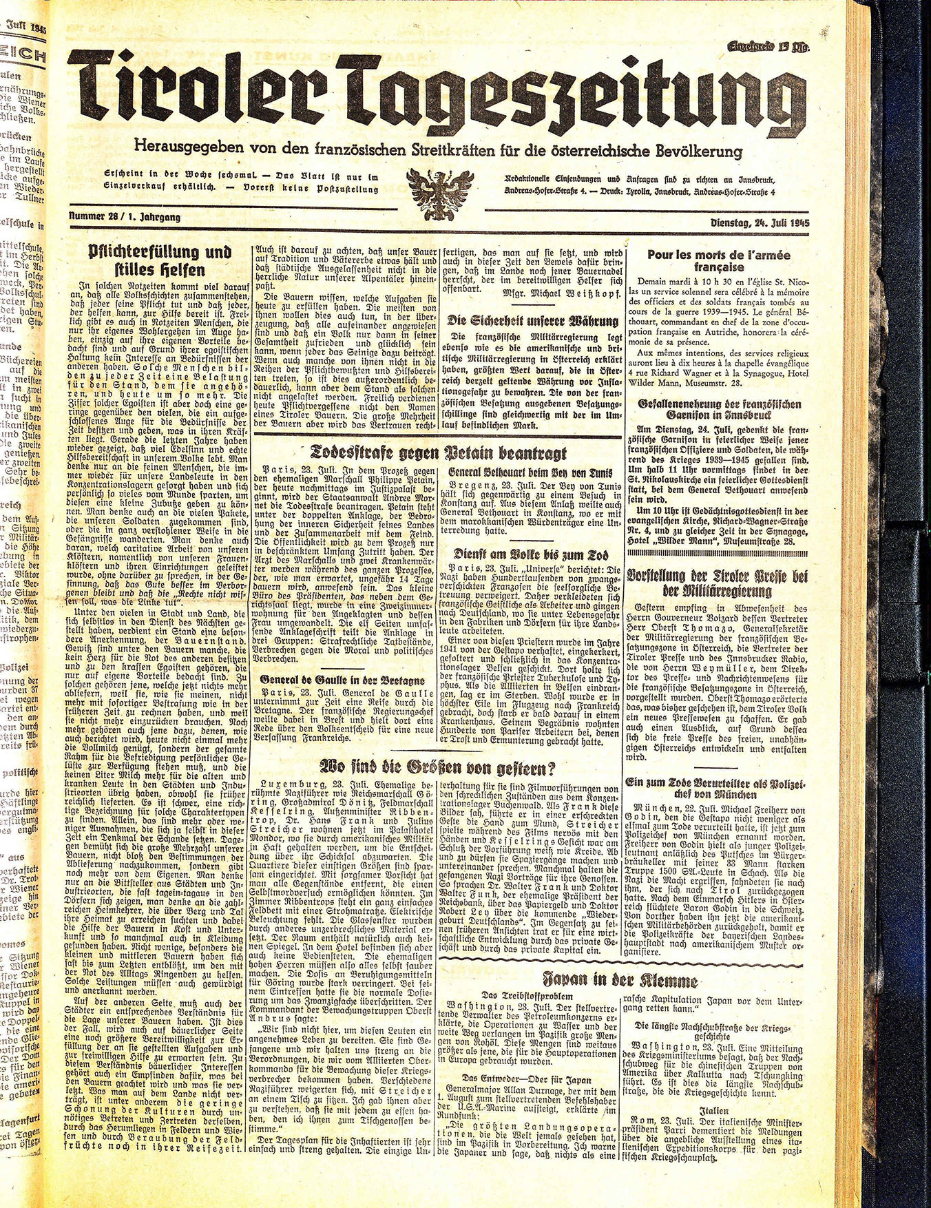 Gestern empfing in Abwesenheit des Herrn Gouverneur Voizard dessen Vertreter Herr Oberst Thomazo, Generalsekretär der Militärregierung der französischen Besatzungszone in österreich, die Vertreter der Tiroler Presse und des Innsbrucker Radio, die von Herrn Weymüller, dem Direktor des Presse= und Nachrichtenwesens für die französische Besatzungszone in österreich, vorgestellt wurden. Oberst Thomazo erörterte das, was bisher geschehen ist, dem Tiroler Volk ein neues Pressewesen zu schaffen. Er gab auch einen Ausblick, auf Grund dessea sich die freie Presse des freien, unabhängigen Österreichs entwickeln und entfalten wird.