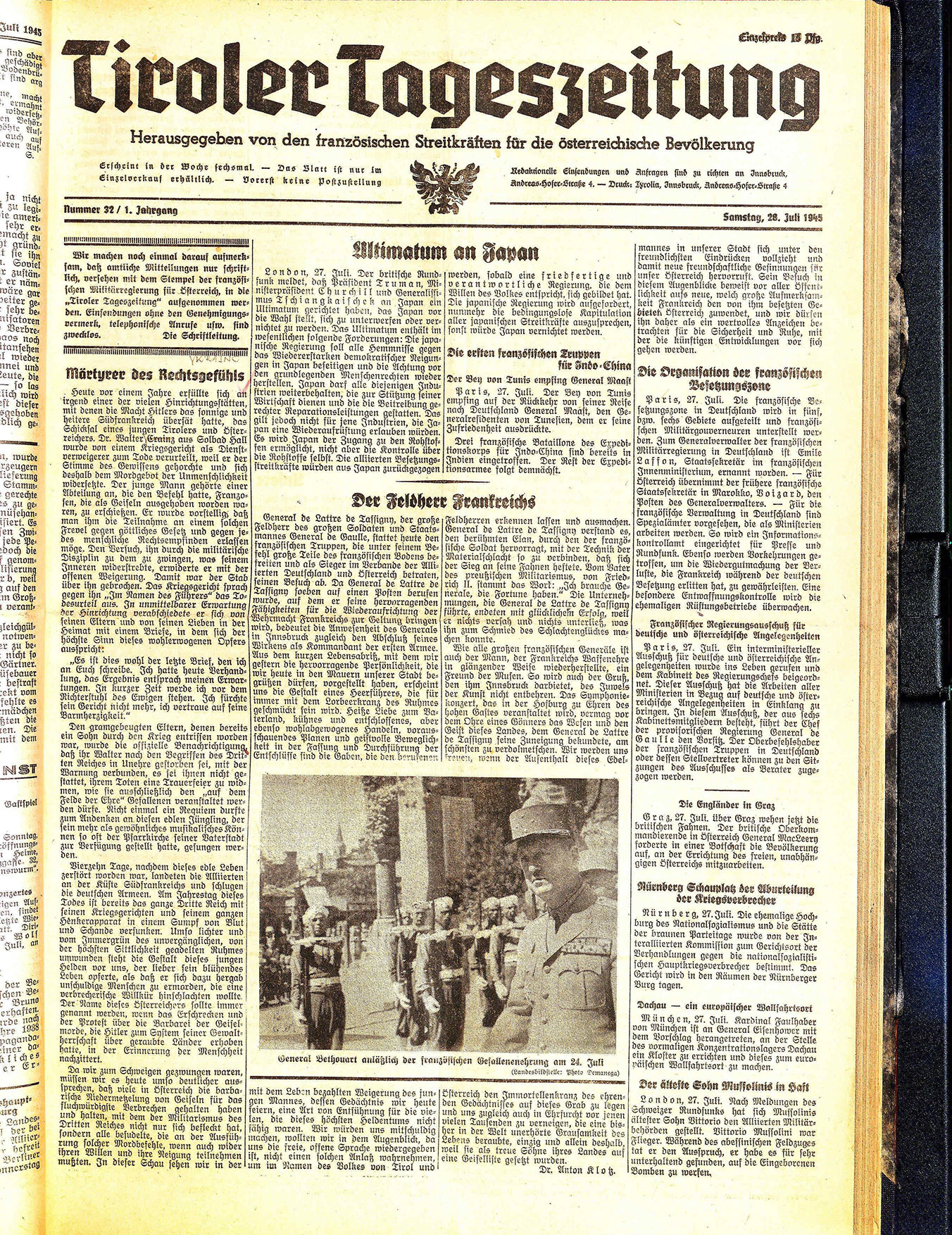 General de Lattre de Tassigny, der große Feldherr des großen Soldaten und Staatsmannes General de Gaulle, stattet heute den französischen Truppen, die unter seinem Befehl große Teile des französischen Bodens befreiten und als Sieger im Verbande der Alliierten Deutschland und Österreich betraten, seinen Besuch ab. Da General de Lattre de Tassigny soeben auf einen Posten berufen wurde, auf dem er seine hervorragenden Fähigkeiten für die Wiederaufrichtung der Wehrmacht Frankreichs zur Geltung bringen wird, bedeutet die Anwesenheit des Generals in Innsbruck zugleich den Abschluß seines Wirkens als Kommandant der ersten Armee. Aus dem kurzen Lebensabriß, mit dem wir gestern die hervorragende Persönlichkeit, die wir heute in den Mauern unserer Stadt begrüßen dürfen, vorgestellt haben, erscheint uns die