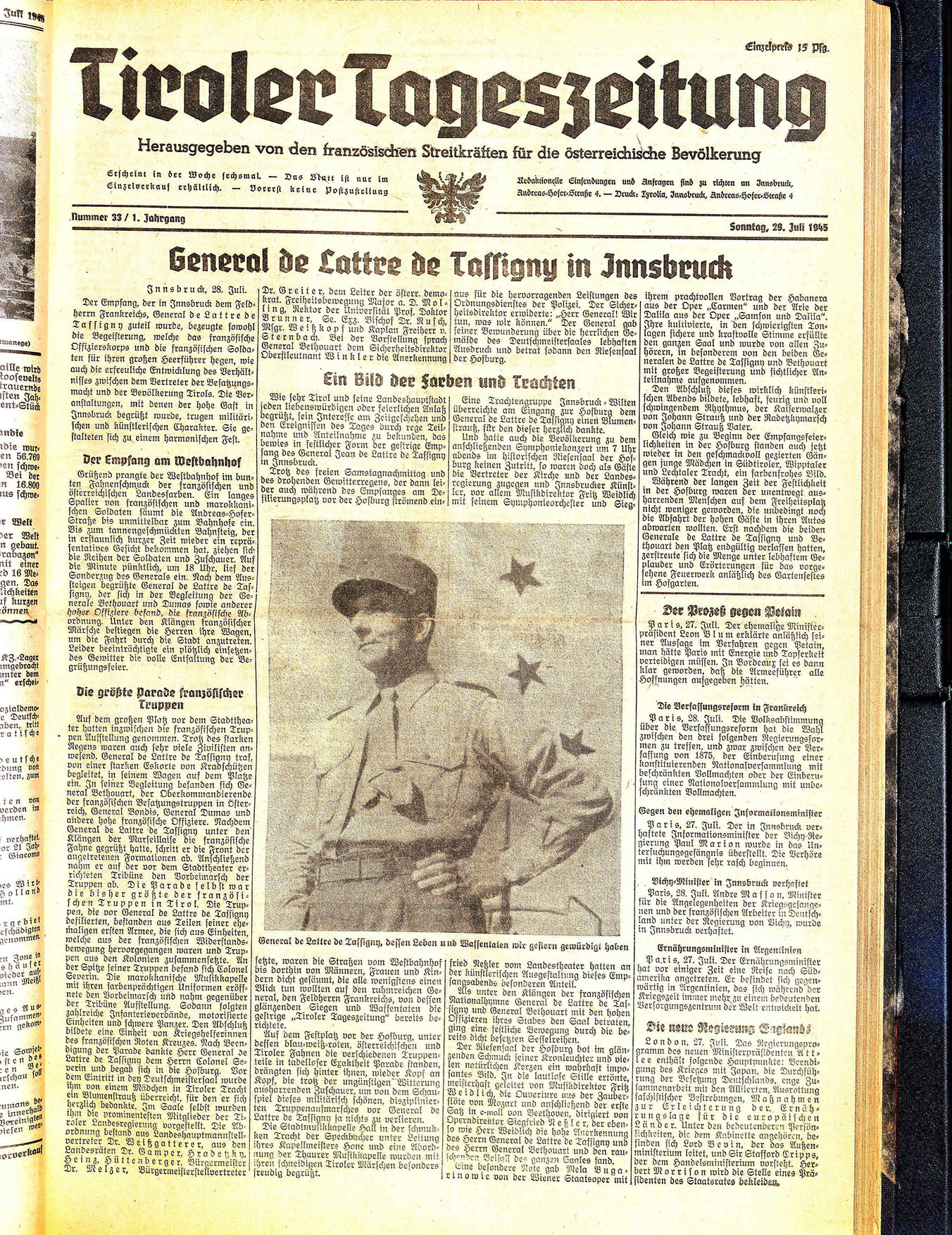 französischen Truppen in Tirol. Die Truppen, die vor General de Lattre de Tassigny defilierten, bestanden aus Teilen seiner ehemaligen ersten Armee, die sich aus Einheiten, welche aus der französischen Widerstandsbewegung hervorgegangen waren und Truppen aus den Kolonien zusammensetzte. An der Spitze seiner Truppen befand sich Colonel Severin. Die marokkanische Musikkapelle mit ihren farbenprächtigen Uniformen eröffnete den Vorbeimarsch und nahm gegenüber der Tribüne Aufstellung. Sodann folgten zahlreiche Infanterieverbände, motorisierte Einheiten und schwere Panzer. Den Abschluß