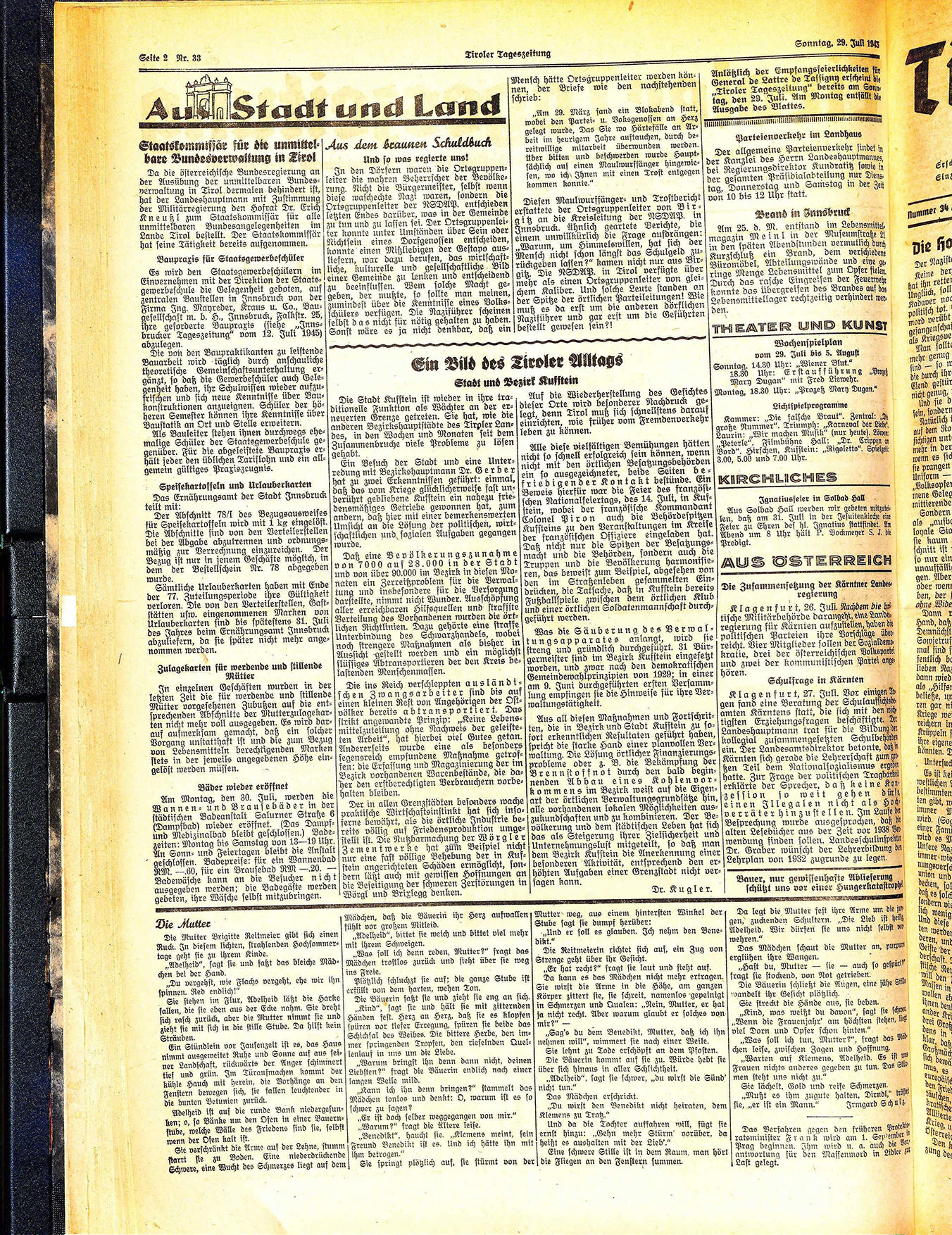 Da die österreichische Bundesregierung an der Ausübung der unmittelbaren Bundesverwaltung in Tirol dermalen behindert ist, hat der Landeshauptmann mit Zustimmung der Militärregierung den Hofrat Dr. Erich Kneußl zum Staatskommissär für alle unmittelbaren Bundesangelegenheiten im Lande Tirol bestellt. Der Staatskommissär hat seine Tätigkeit bereits ausgenommen.