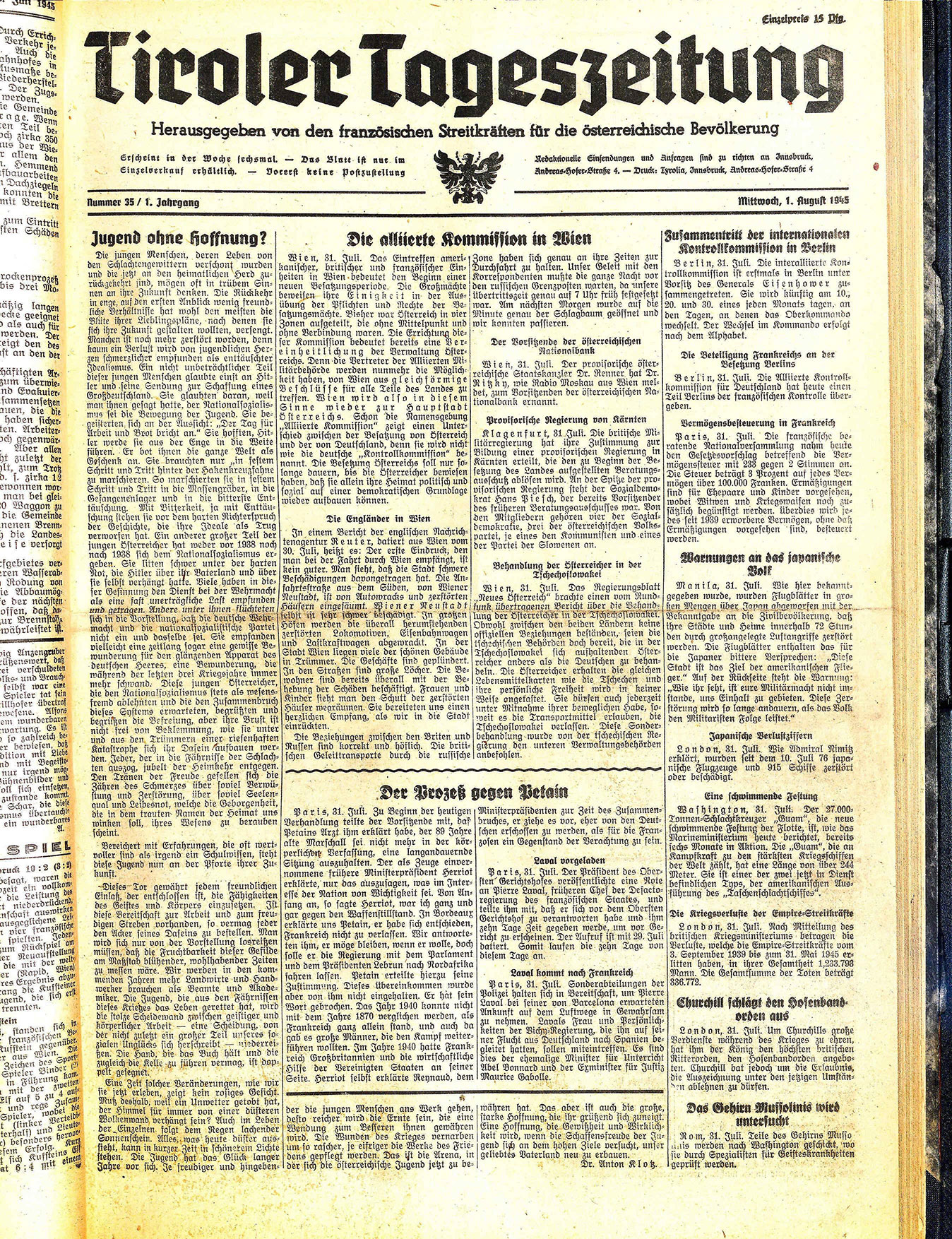 In einem Bericht der englischen Nachrichtenagentur Reuter, datiert aus Wien vom 30. Juli, heißt es: Der erste Eindruck, den man bei der Fahrt durch Wien empfängt, ist kein guter. Man sieht, daß die Stadt schwere Beschädigungen davongetragen hat. Die Anfahrtsstraße aus dem Süden, von Wiener Neustadt, ist von Autowracks und zerstörten Häusern eingesäumt. Wiener Neustadt selbst ist sehr schwer beschädigt. In großen Höfen werden die überall herumstehenden zerstörten Lokomotiven, Eisenbahnwagen und Lastkraftwagen abgewrackt. In der Stadt Wien liegen viele der schönen Gebäude in Trümmer. Die Geschäfte sind geplündert. In den Straßen sind große Löcher. Die Bewohner sind bereits überall mit der Behebung der Schäden beschäftigt. Frauen und Kinder