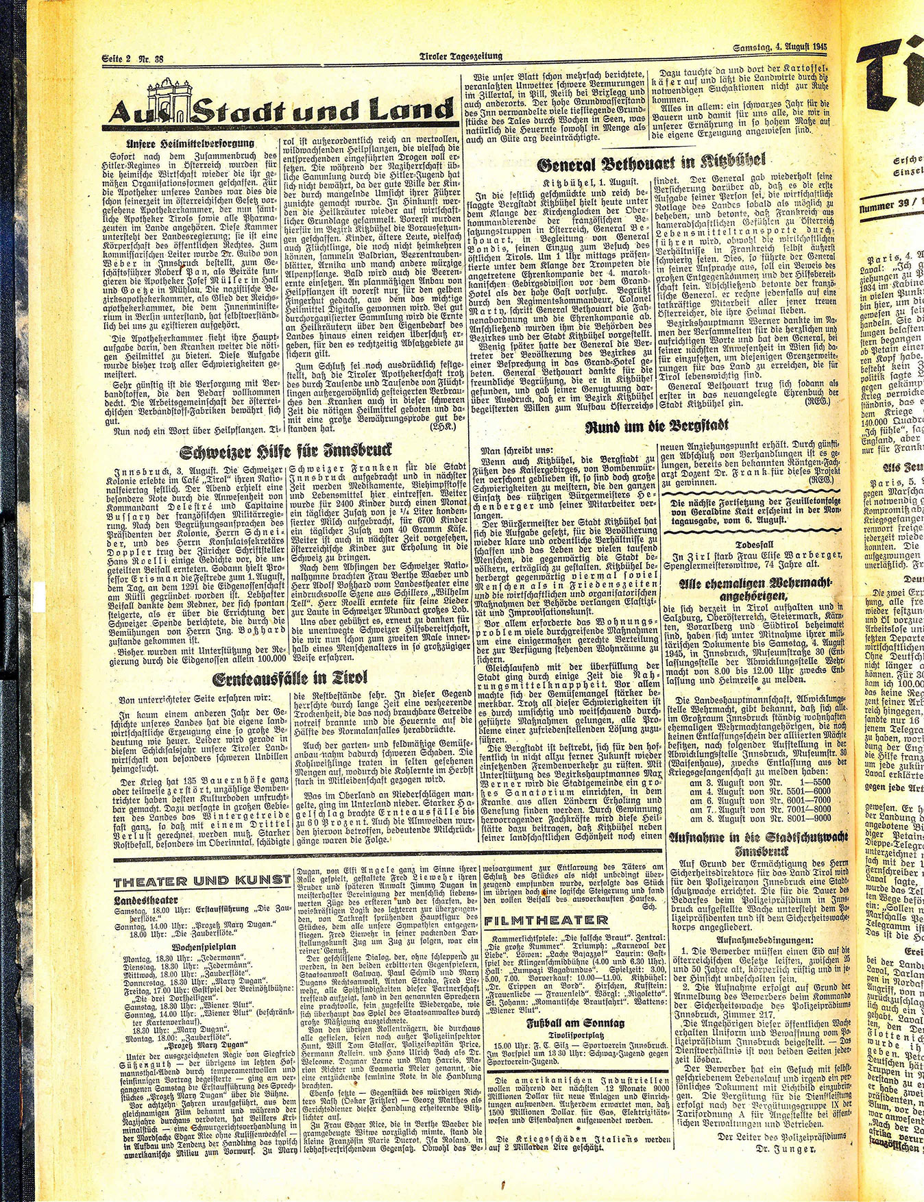Innsbruck, 3. August. Die Schweizer Kolonie erlebte im Café „Tirol“ ihren Nationalfeiertag festlich. Der Abend erhielt eine besondere Note durch die Anwesenheit von Kommandant Delestré und Capitaine Bussary der französischen Militärregierung. Nach den Begrüßungsansprachen des Präsidenten der Kolonie, Herrn Schneider, und des Herrn Konsulatssekretärs Doppler trug der Züricher Schriftsteller Hans Roelli einige Gedichte vor, die ungeteilten Beifall ernteten. Sodann hielt Professor Erisman die Festrede zum 1. August, dem Tag, an dem 1291 die Eidgenossenschaft am Rütli gegründet worden ist. Lebhafter Beifall dankte dem Redner, der sich spontan steigerte, als er über die Errichtung der Schweizer Spende berichtete, die durch die Bemühungen von Herrn Ing.